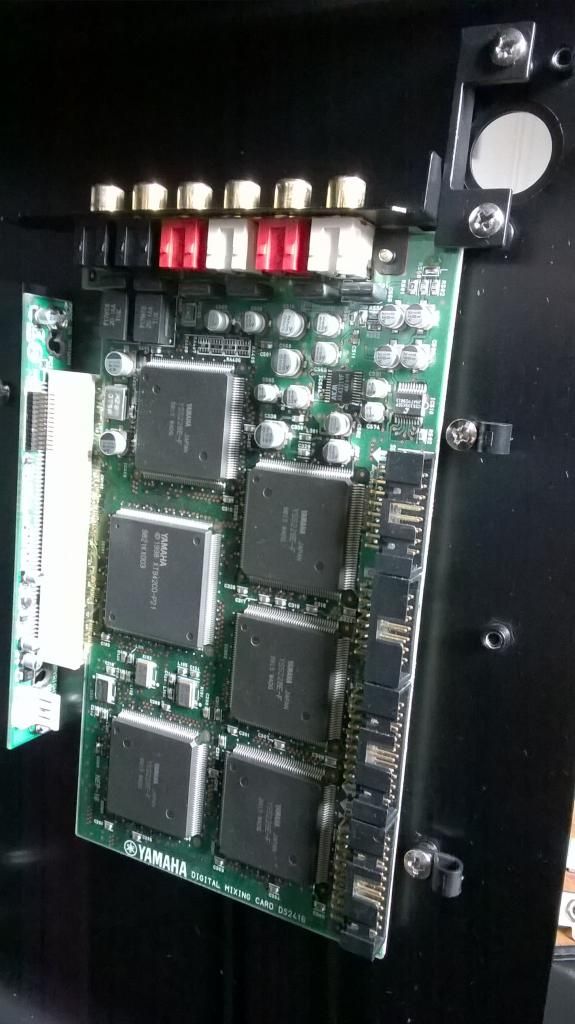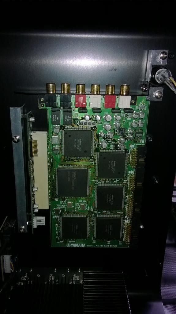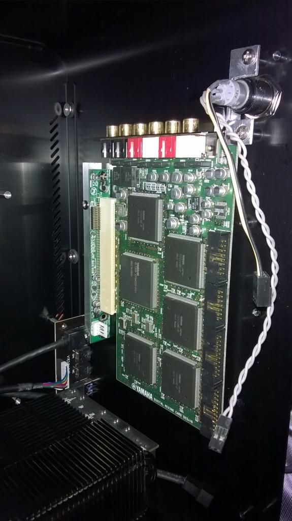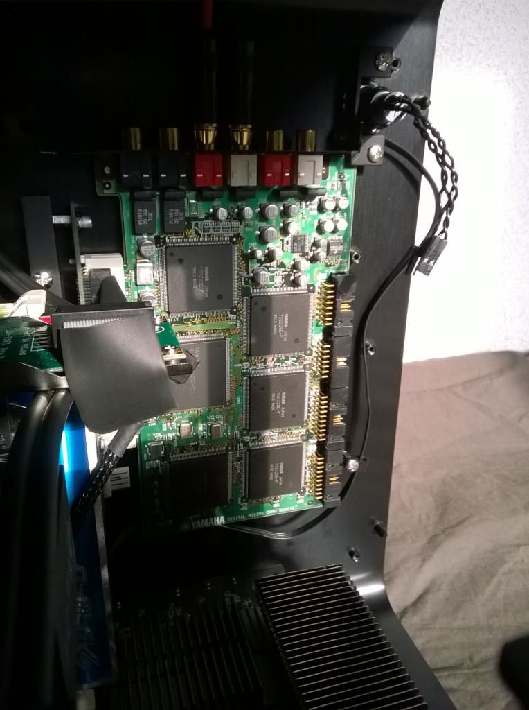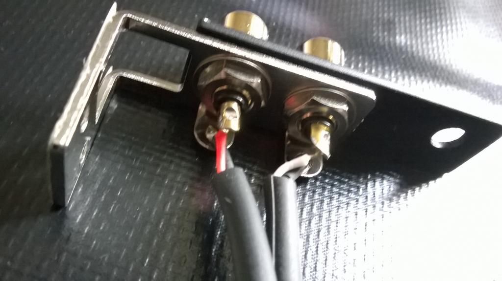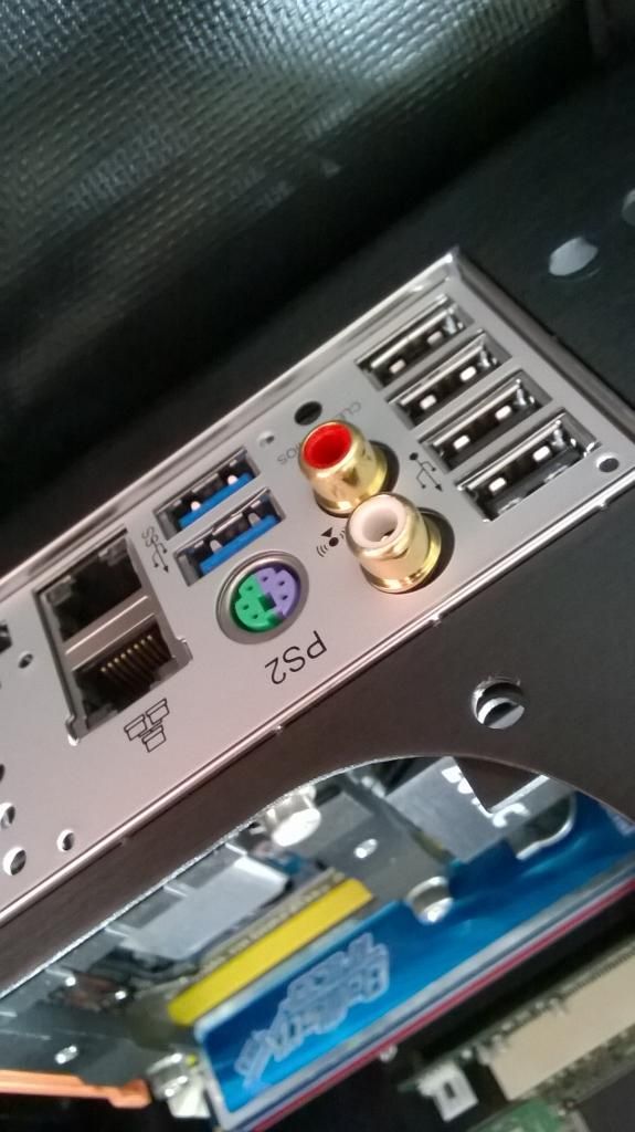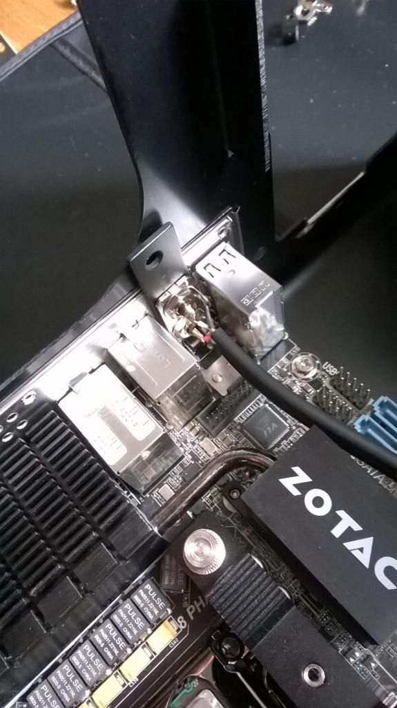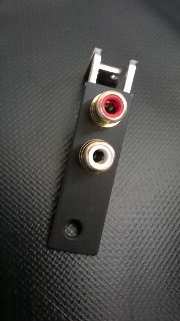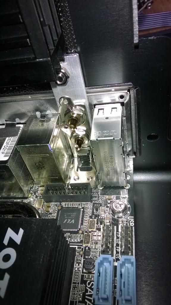 Ik hoor je denken "Nu heb je een geluidskaart binnen in je kastje zitten, hoe ga je die dan aansluiten?". Nou, de WiFi module van het moederbord wordt vervangen voor de PCI riser. Hierdoor blijven achter bij het moederbord twee gaatjes over waar precies tulp connectors in passen. Even zoeken bij conrad voor connectors met de juiste schroefdraad diameter; en gevonden! Helaas merkte ik bij het testen dat het beugeltje voor de WiFi antennes niet geschikt was voor tulpstekkers, waar je aardig wat kracht op moet zetten om ze aan te sluiten. Ik moest dus nog een plaatje maken om deze te verstevigen en nog ergens aan te bevestigen.