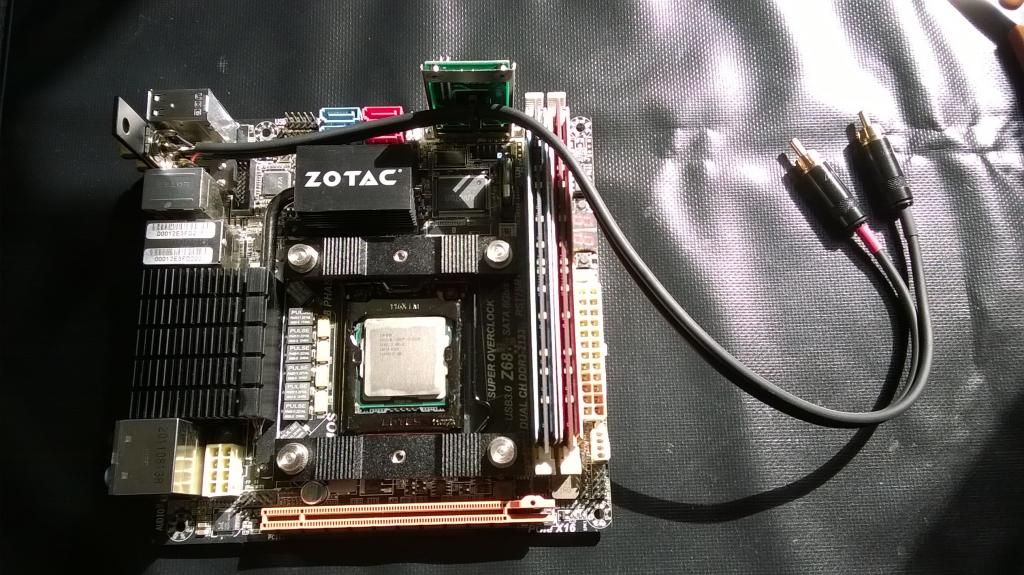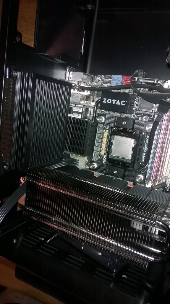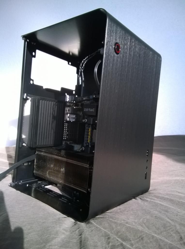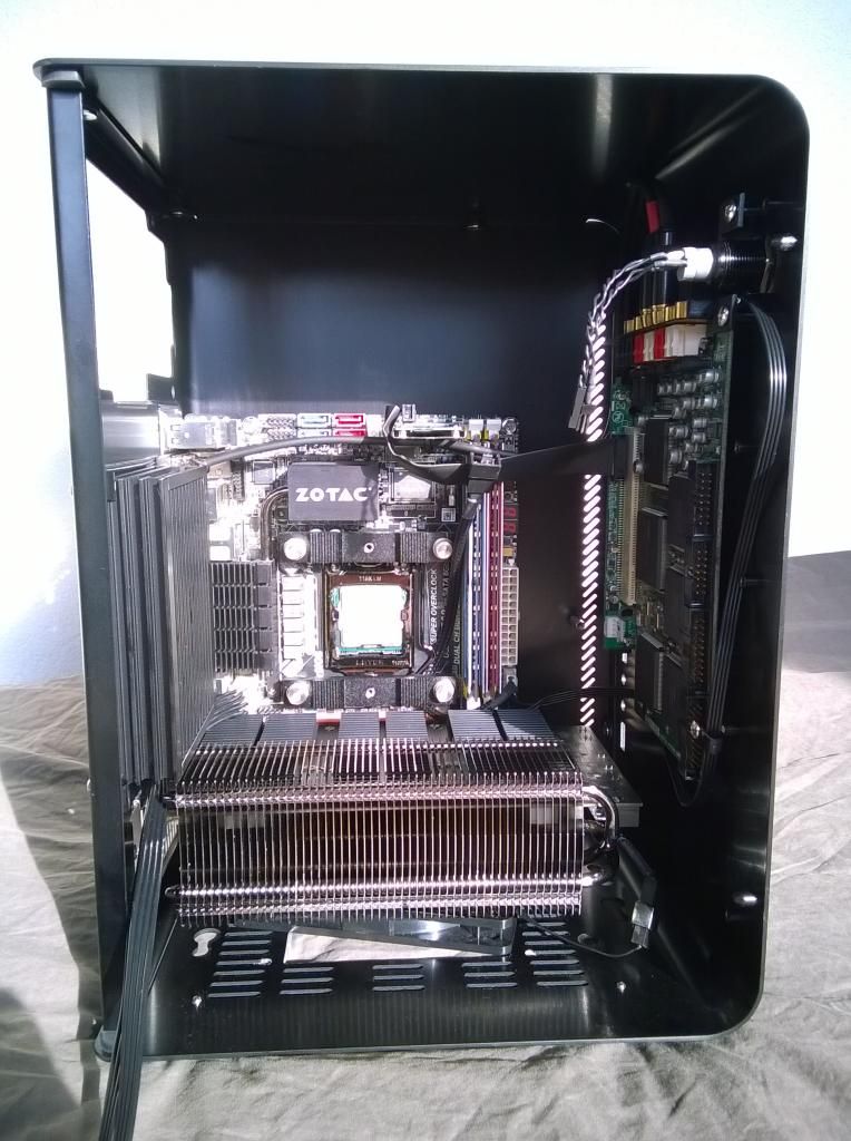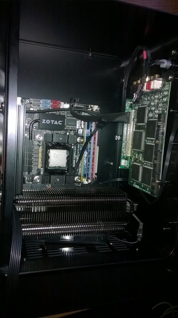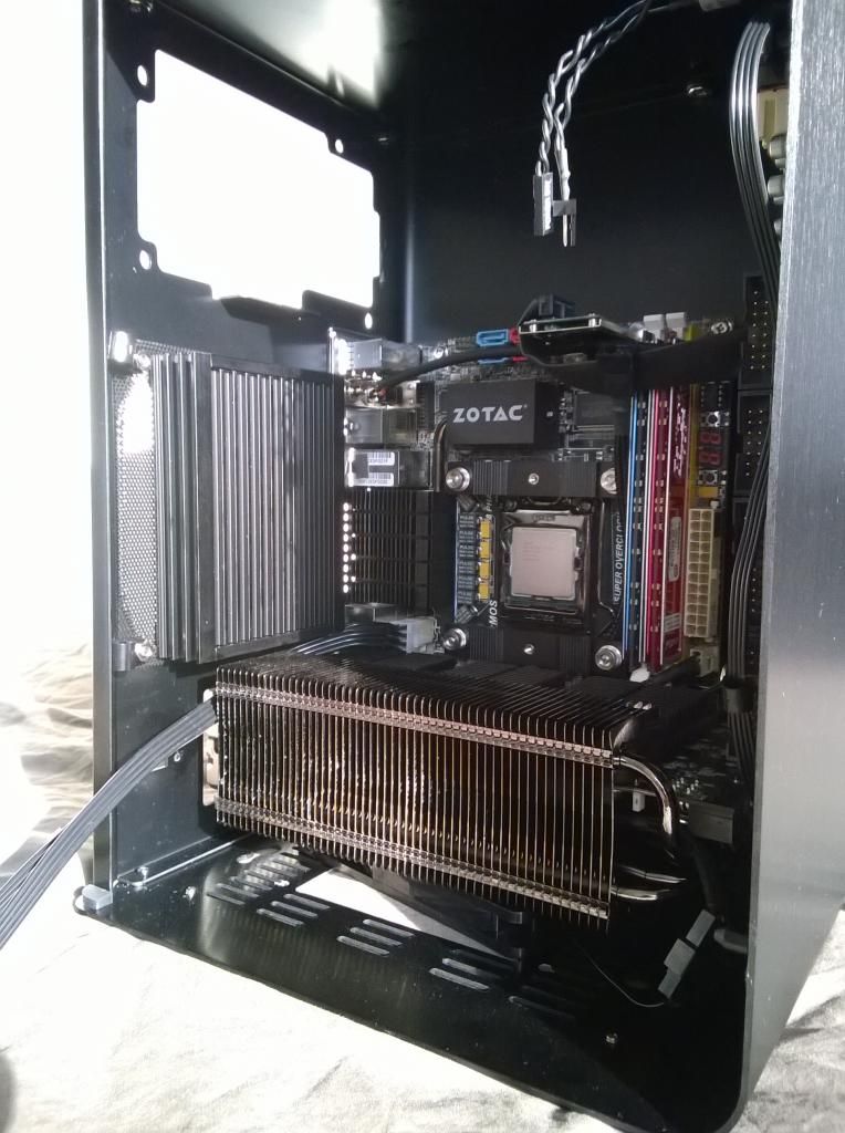 Maar daar wilt deze persoon ook nog een geluidskaart in steken en er moet niet teveel herrie uit komen. Zodoende kwam ik met het volgende; ik moet een moederbord hebben met een Mini PCI-e slot. De Zotac Z68-ITX WiFi was de meest geschikte kandidaat, met z'n mooie zwart geanodiseerde heatsinks en black nickel heatpipe, perfect voor dit systeem want er komt ook nog een videokaart in met een black nickel heatsink, een Powercolor HD6850 SCS3, helaas bleek deze net niet te passen, de 6-pins connector kon niet meer aangesloten worden, en dus werd er gezocht naar een korter videokaartje waar de koeler van de HD6850 wel op past. Dat werd een VTX3D HD7850 X-Edition.