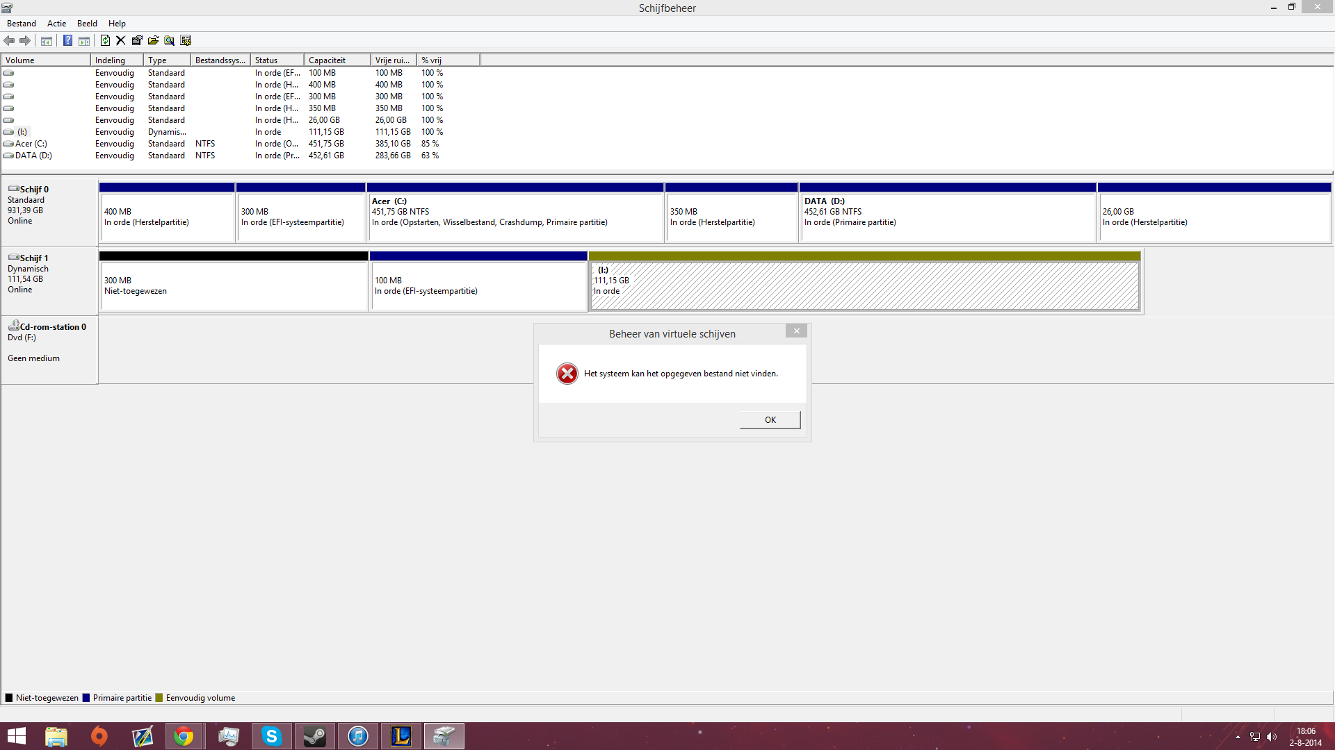 Toen begon de fout: Ik verwijderde alle partities van de SSD (Waar die Windows op stond die ik niet kon activeren), dit lukte. Vervolgens probeerde ik om de main partitie groter te maken, hier veranderde ik mijn SSD perongeluk in een dynamische schijf. Ik ben van plan om een USB stick te maken met de fabriekstandaard erop en deze vervolgens op te starten, maar dan zal ik eerst mijn disk moeten veranderen naar de standaard. Heb het via opdrachtpompt en via schijfbeheer al geprobeerd. Niks mocht baten krijg namelijk de volgende melding: