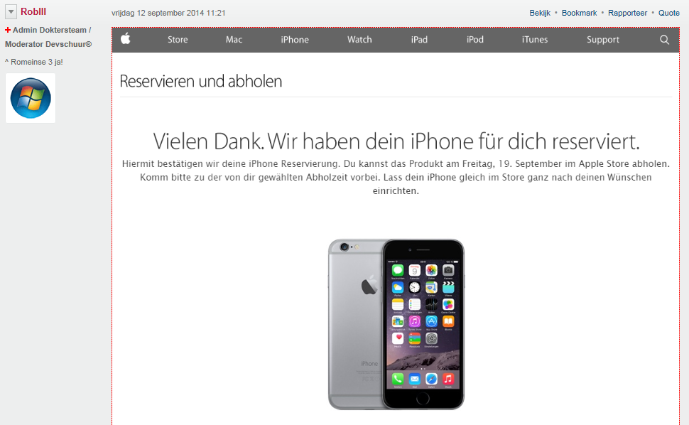 Max 1 bestelling per Apple-account; m'n collega wou een grijze, ik een 'zwarte' en dat moesten dus 2 bestellingen worden (dus ieder op z'n eigen Apple-account). Geen idee hoeveel 'dezelfde' foons je op een order kon doen; er stond wel een dropdown met "menge" (aantal) maar geen idee hoe ver die ging (en of 'ie dus wel verder ging dan 1BtM909 schreef op vrijdag 12 september 2014 @ 11:53: