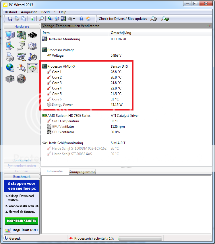 Nu heb ik een AMD FX processor dus dat zou het probleem moeten verklaren, maar ik denk dat het niet helemaal klopt wat daar staat want via PC Wizzard 2013 kan ik wel de individuele Core temperaturen zien (screenshot).