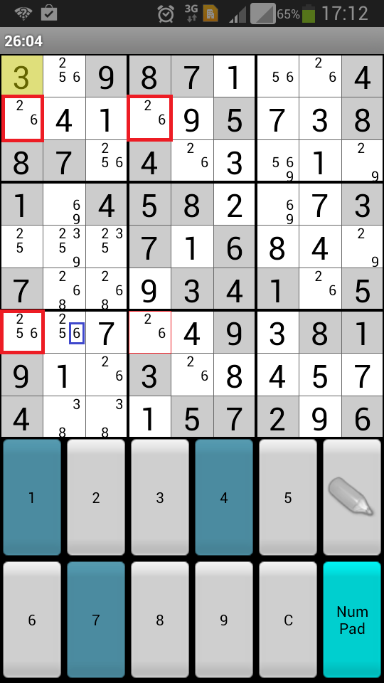 Vervolgens weet ik door middel van een X-wing (rode 6én) nog de zes in het blauwe vak uit te sluiten: