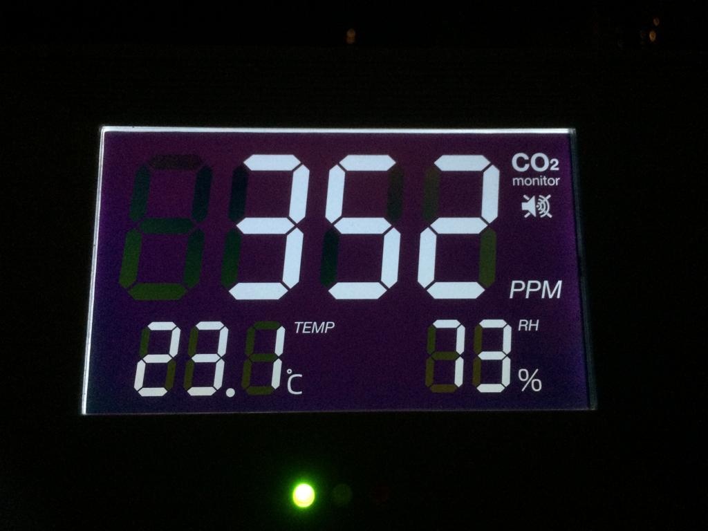 Het resultaat van enkele keren in/uitademen op 50 cm afstand van een CO2/r.h./temperatuur monitor (tijd op het plaatje rond 17:38):