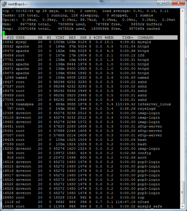 Mijn vps (CentOS 6.5 Final +Directadmin) heeft tot nu toe met de standaard configuratie gedraaid. Bij een kleine ddos kwam ik er achter dat deze configuratie toch niet helemaal perfect was. Memory liep vol en ondanks <10% cpu usage was niks meer vooruit te branden.