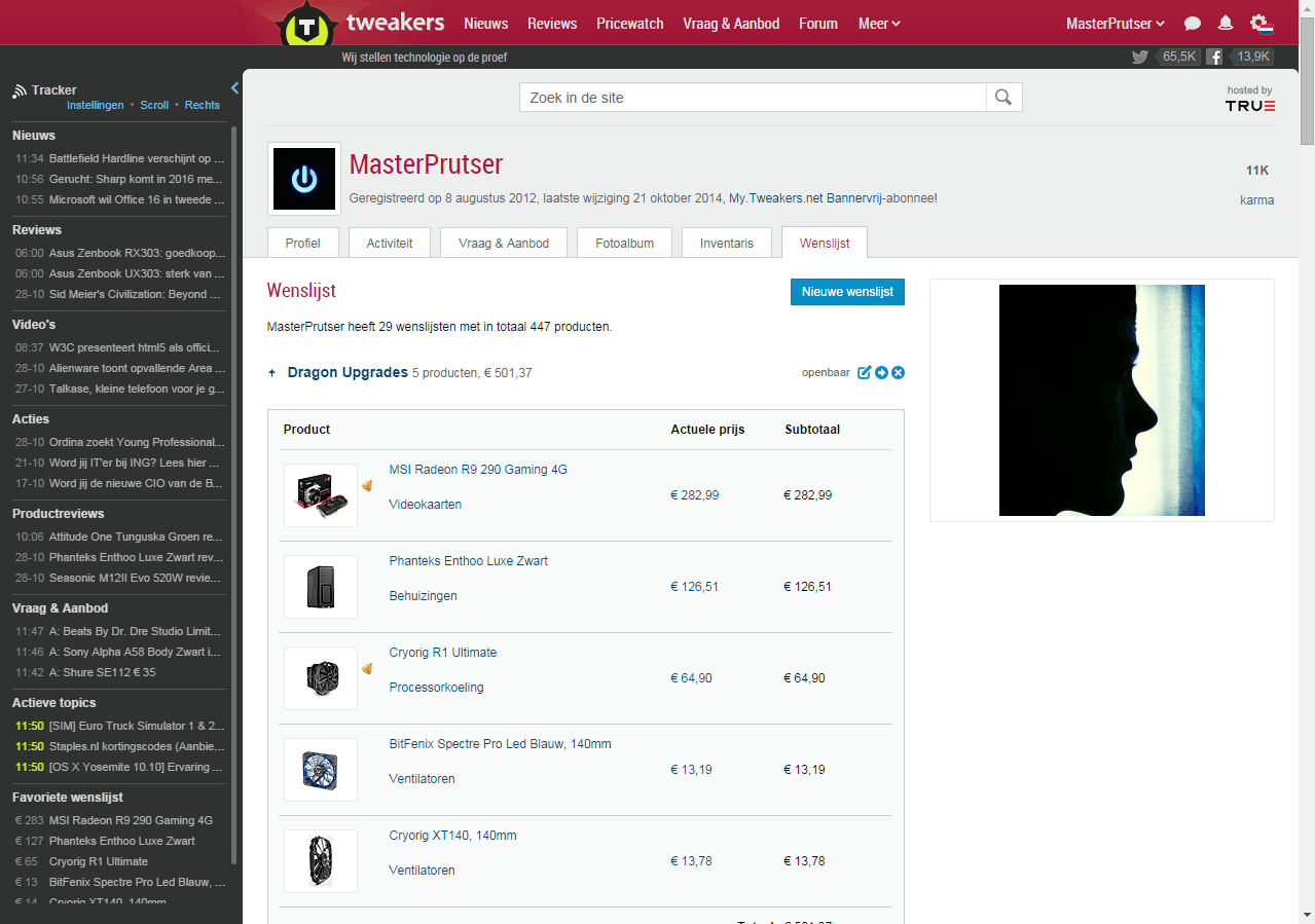 Hier staat boven de wenslijst "Dragon Upgrades 10 producten, € 1.003,34"