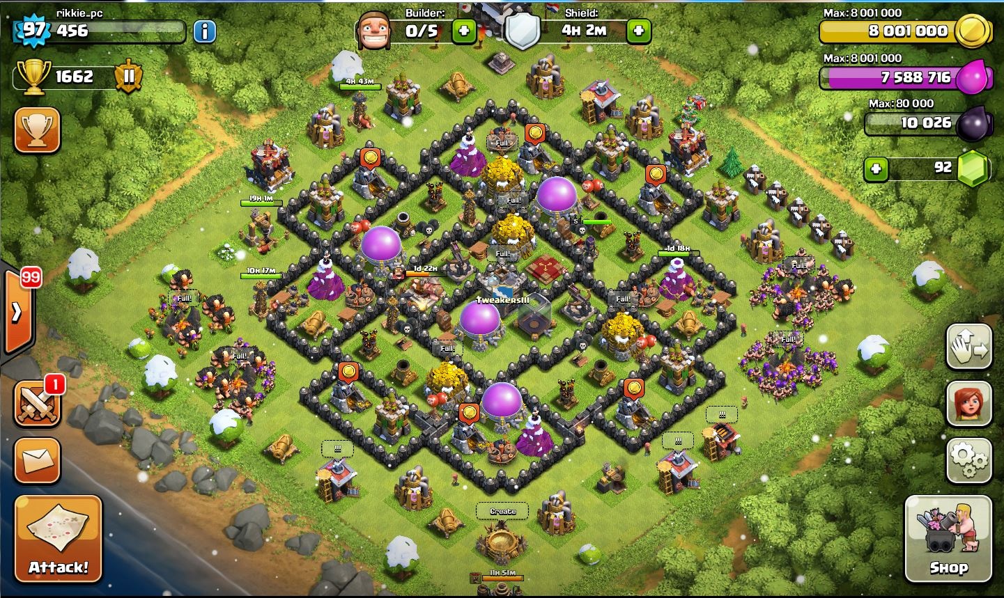 Intussen bijna maxxed TH8-defences: nog één Tesla van lvl5 naar lvl6 en drie AT's van lvl9 naar lvl10 en dan is dat al achter de rug. Die single bombs naar lvl5 is ook nog een vervelend tussendoortje.