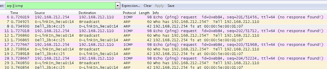 - Als de switch als gateway 192.168.212.254 heeft (het gedeelde IP adres), dan reageert de switch niet op pings uit andere vlans (en dus ook niet op ander verkeer).