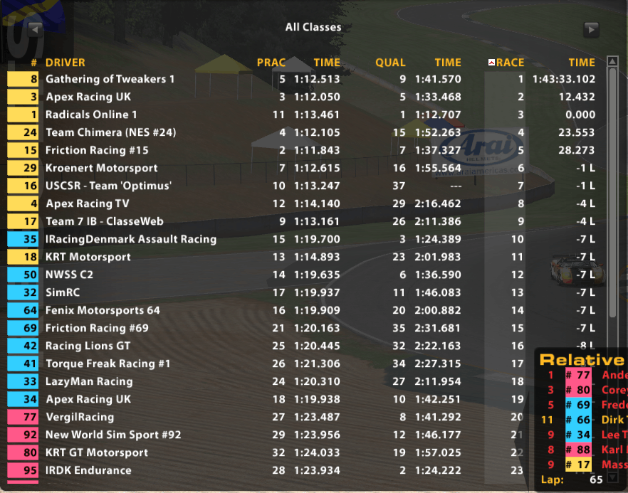 Dan zondag met de NES in de Ford GT van Racing Lions. Het begon allemaal erg mooi, een hoop concurrenten waren uitgeschakeld en we begonnen ondertussen aan een 4de plek te denken. Helaas schat Robbert de snelheid van een RUF verkeerd in, verliest daarbij de controle. Een aanstormende HPD kan ons niet meer ontwijken en we hebben 9 minuten repairs.
