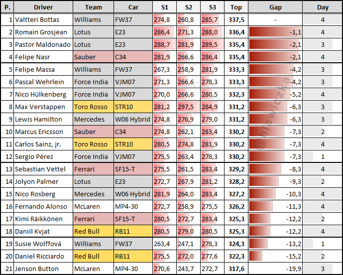 Button zit net onder de top en Rosberg is net in alles 1% minder dan Hamilton.