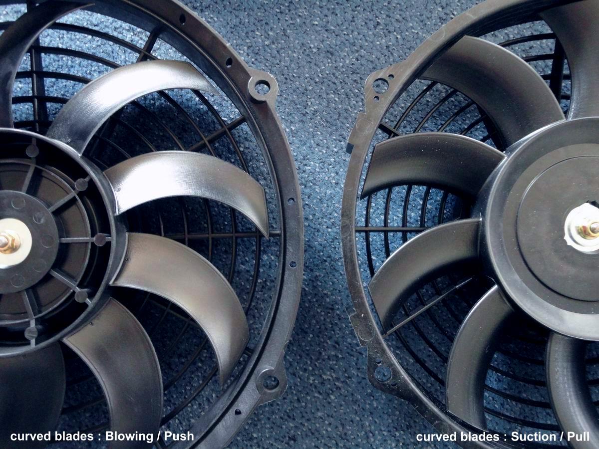 Ze staan identiek, alleen in spiegelbeeld, dat doe je normaal gesproken met twee fans naast elkaar om minder turbulentie te krijgen. Als het pull zou zijn, zou het schelpje van het fanblad andersom zijn. Zodat je zeg maar lucht in het schelpje houdt. Nu is het schelpje voor pull verkeerd om waardoor de lucht er gewoon "afglijd".