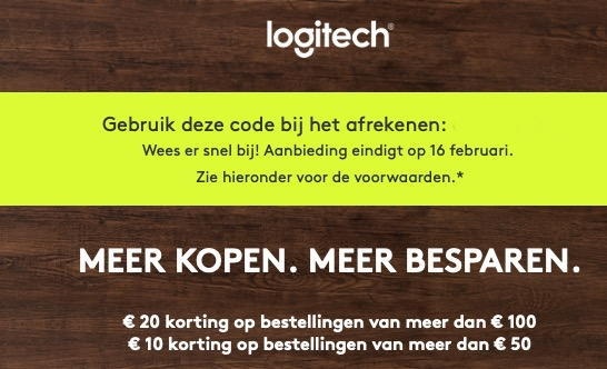 *Beperkt tot 3 artikelen per huishouden. Aanbieding geldt alleen voor bestelling en verzending in Nederland tussen 13-2-2020 en 16-2-2020. Korting kan worden toegepast met de unieke couponcode in deze e-mail. Korting wordt toegepast wanneer je de couponcode invoert tijdens het betaalproces. Code mag slechts één keer worden gebruikt. Exclusief verzendkosten en btw. Verkopers, distributeurs en andere wederverkopers komen niet in aanmerking voor deze aanbieding. Met uitzondering van K860, Dali, MX Keys, MX Keys Plus, Pebble, K580, Rugged Folio, Slim Folio 7e generatie, Slim Folio Pro voor iPad Pro 11", Slim Folio Pro voor iPad Pro 12,9" (3e generatie), MX Master 3, MX Vertical, K600, C922, G Pro Wireless, Pro X Keyboard, G502 Wireless, Adaptive Gaming Kit, G915, G815, G604 Lightspeed, Pro Headset, Pro X Headset, Lightspeed, Saitek-producten, Producten voor videosamenwerking, Astro Gaming-producten, Ultimate Ears-producten, Jaybird-producten, producten voor B2B-videosamenwerking (oplossingen voor vergaderruimtes, Conference Cameras, webcams en headsets) en reserveonderdelen. Extra bepalingen, voorwaarden, producten, prijzen en aanbiedingen zijn onderhevig aan verandering zonder kennisgeving. Kan niet worden gecombineerd met andere aanbiedingen.