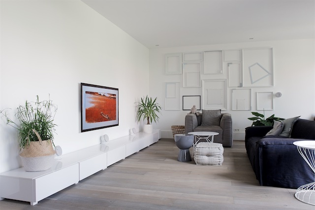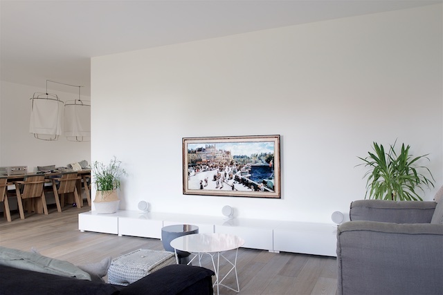 Zo'n witte muur schreeuwt naar het ophangen van je tv. Snap eigenlijk sowieso niet dat mensen tijdens het stucen niet even een kabelgoot in de muur laten frezen. Ziet er strakker uit en verbergt heleboel kabels. Hoeven er ook geen kussens gebruikt te worden.