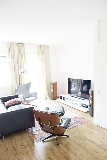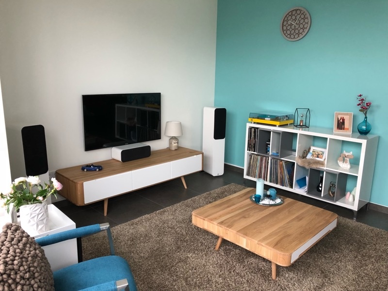 Met beperkte ingrepen kan het geheel minder 'propvol' overkomen, zo is de bruine kast 'erg aanwezig' en helpt de asymmetrische plaatsing van het scherm en de draaitafel/receiver de harmonie in deze setup niet echt.