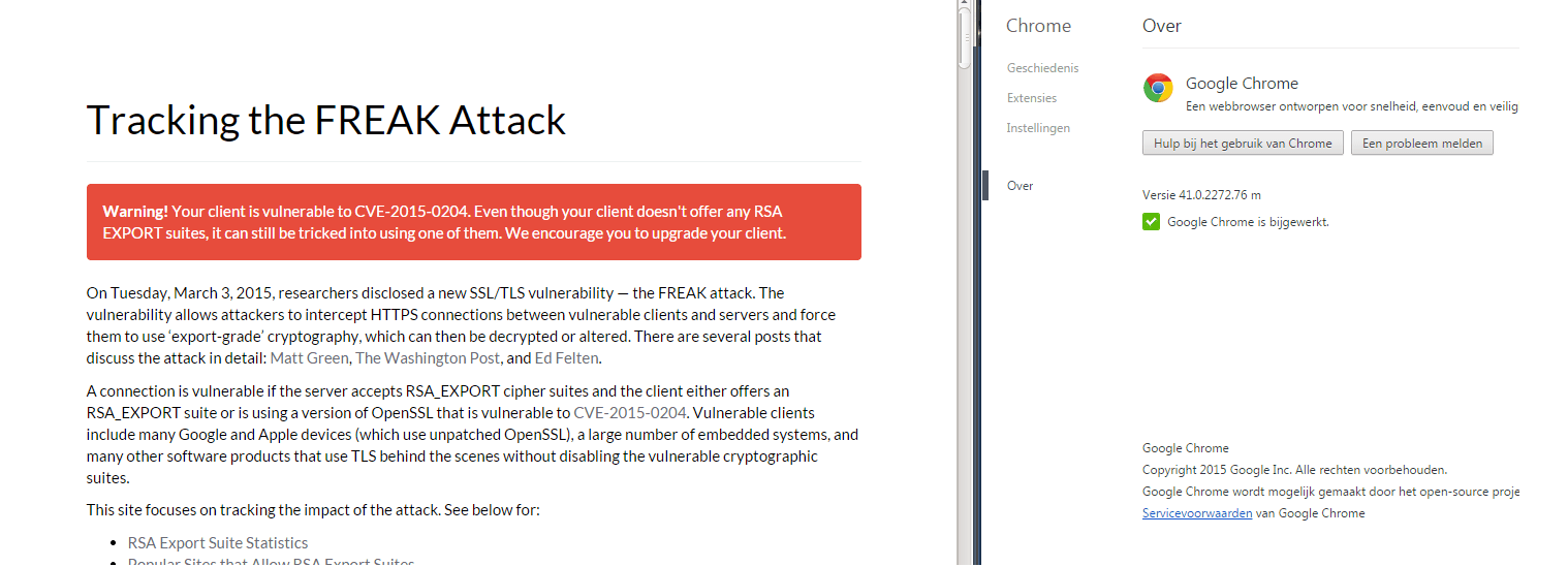 in nieuws: Android- en Apple-gebruikers kwetsbaar dankzij oude backdoor in ssl staat dat Chrome voor Windows niet kwetsbaar is, echter krijg ik op Versie 40.0.2214.115 m de melding dat ik wél kwetsbaar ben.