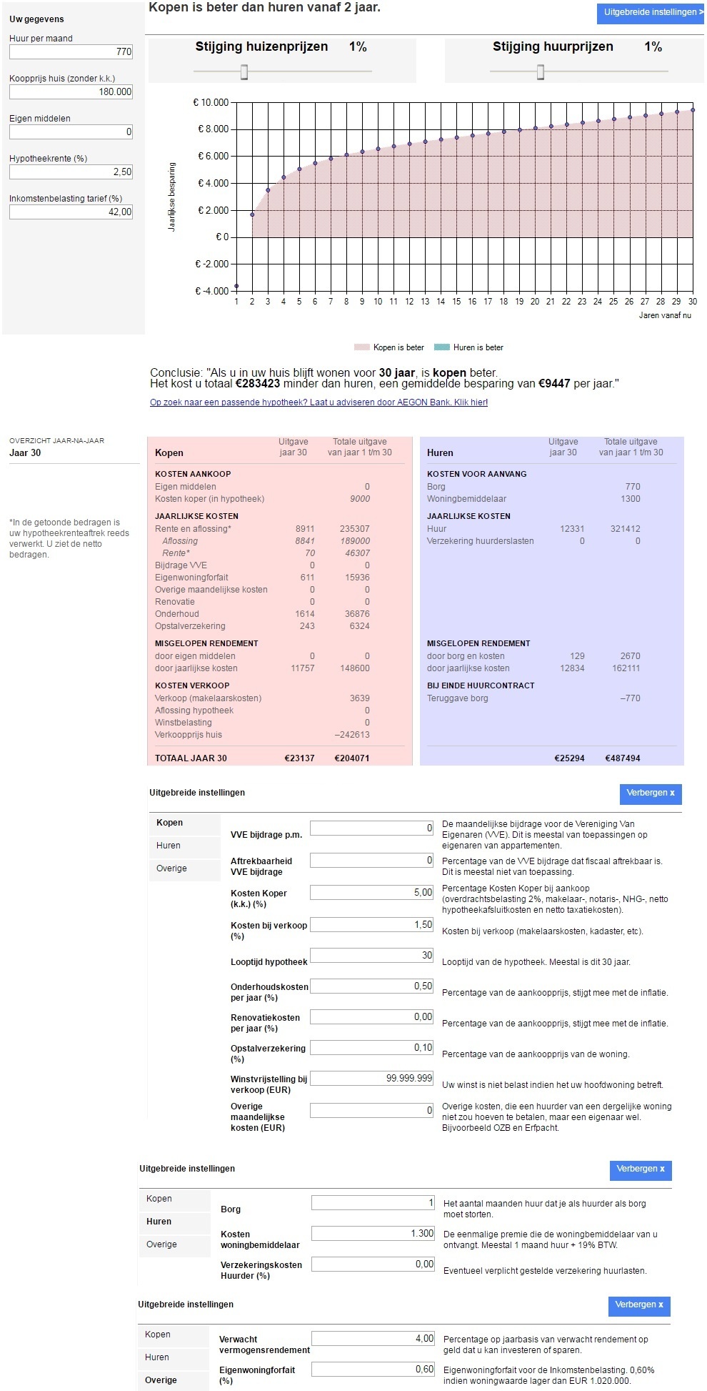 Na 30 jaar, dus bij aflopen hypotheek, heeft de huurder een cashbedrag van 53.008,18 euro meer dan de koper. De koper bezit echter een woning van grof gesteld 344.158,70 euro (190k + 30 jaar 2% inflatie).