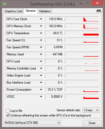 Als ik gewoon idle wat zit te werken dan is de kaart ongeveer 40 graden en staat de fan op 5%.