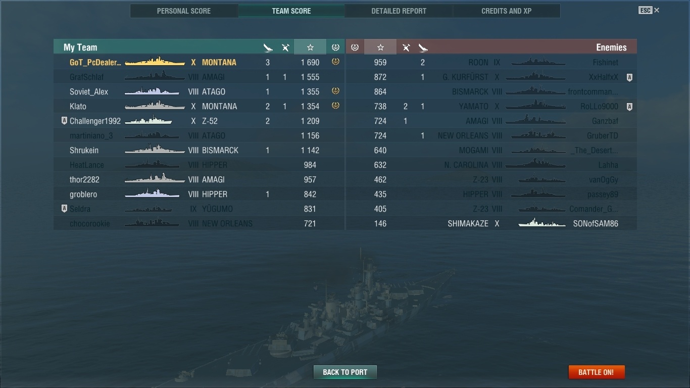 Maaaaar, gelukkig hadden we een GK die het wel snapte, de vijandelijke montana citadelde en torps van een vijandelijk DD ontweek zodat die mooi hun eigen Bismarck konden raken. Oeps.