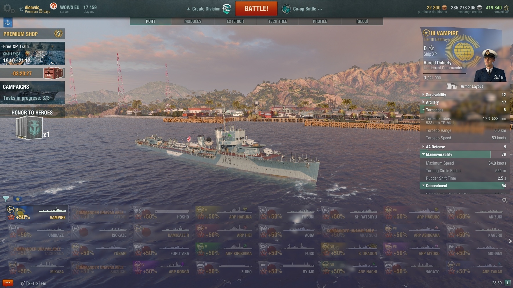 Vampire binnen, en ook de Winter Mystery containers (5000FXP, 250D). Voor die laatste missie werd ik echt getrold met de teams, bovengemiddeld goed gespeeld voor mijn doen, maar zelden zulke weekend warriors gehad (continu 2 pinkies, een keer zelfs 3 in mijn team, en elke keer weer die roze torpedobombers