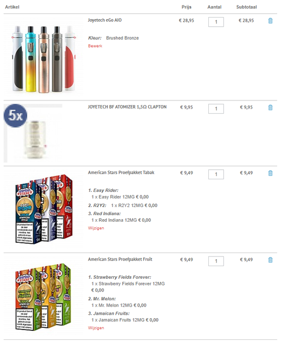 Overtuigd door een collega, dat mijn vriendin veel goedkoper kan roken (en uiteindelijk liquids te gaan kopen waar steeds minder nicotine in zit) gaan wij voor deze: https://roken.nl/product/...io/?attribute_kleur=Zwart met deze coils erbij: BF SS316 1.0ohm coils (5 stuks) (€12.95)