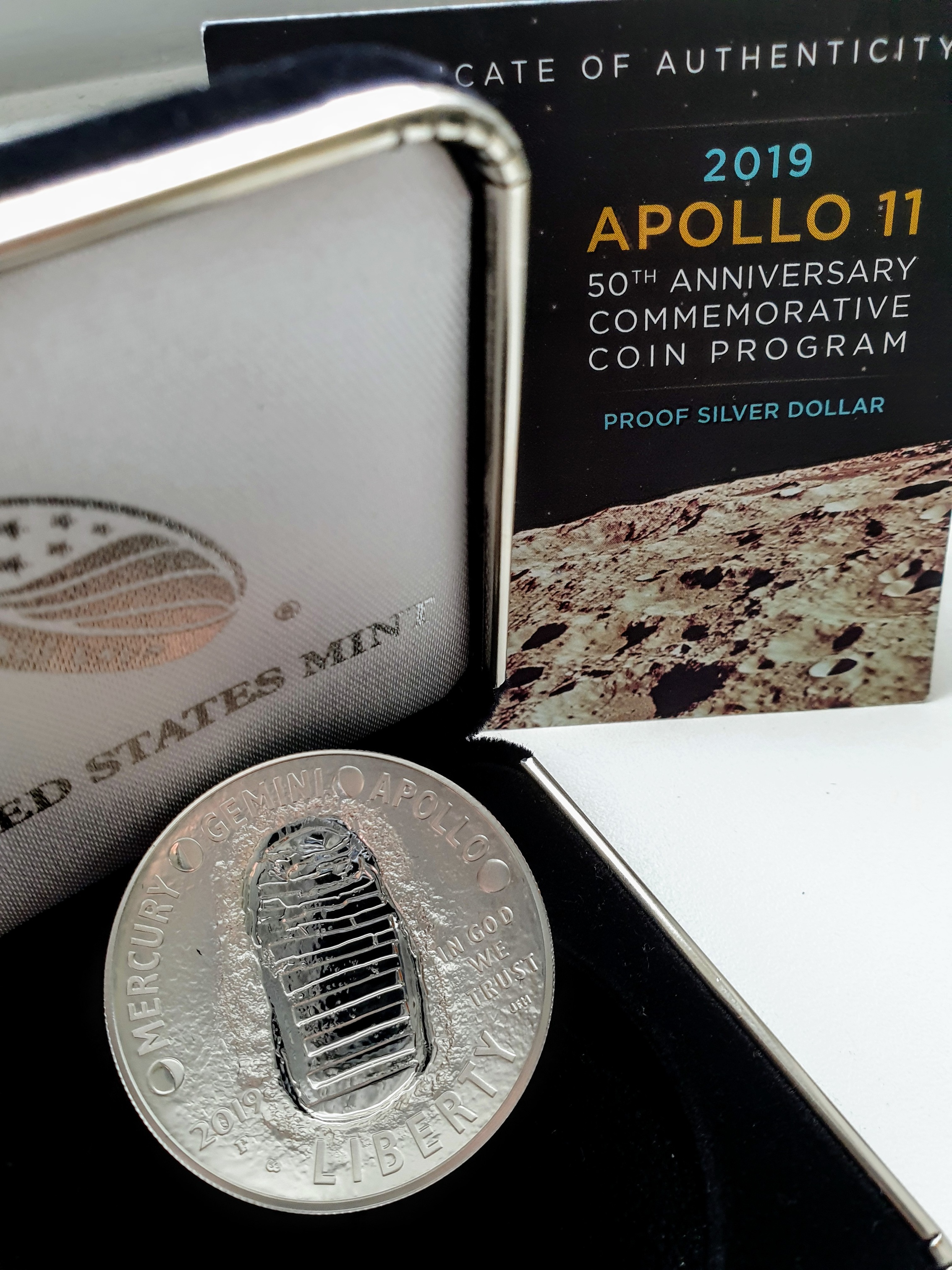 Aan de andere kant zie je een voetafdruk op de maan en de namen van de 3 programma's die tot doel hadden een man op de maan te zetten: Mercury, Gemini en Apollo. Heel fraai, in een beschermende transparante hoes waar ik 'm er voor de foto even heb uit gehaald. Zo blijft ie mooi zonder krasjes of vingerafdrukken.