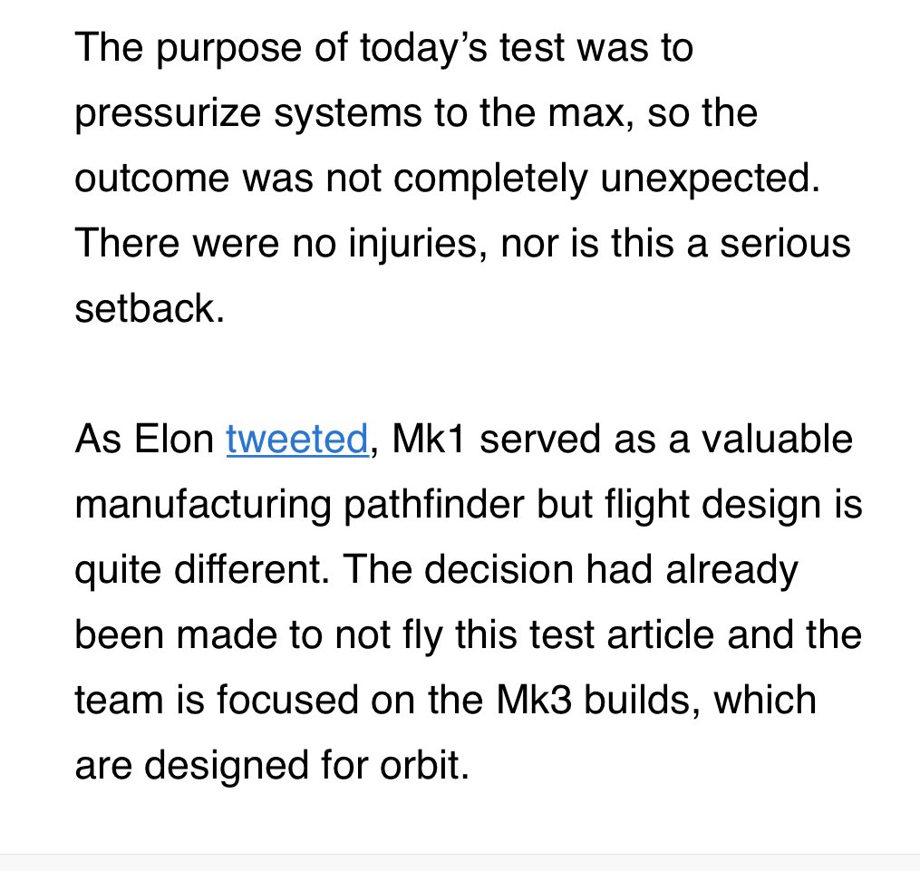Begrijp me niet verkeerd, rakettechnologie is hartstikke moeilijk, en dingen gaan nu eenmaal mis. Dat is erg sneu voor de mensen die hard aan deze technologie werken. Maar MK1 en MK2 stonden tot het fatale moment gewoon op het programma om te vliegen en het was niet de bedoeling dat MK1 bij een druktest uit elkaar zou knallen. Geef dat gewoon toe in plaats van naar de mond van Elon Musk praten.