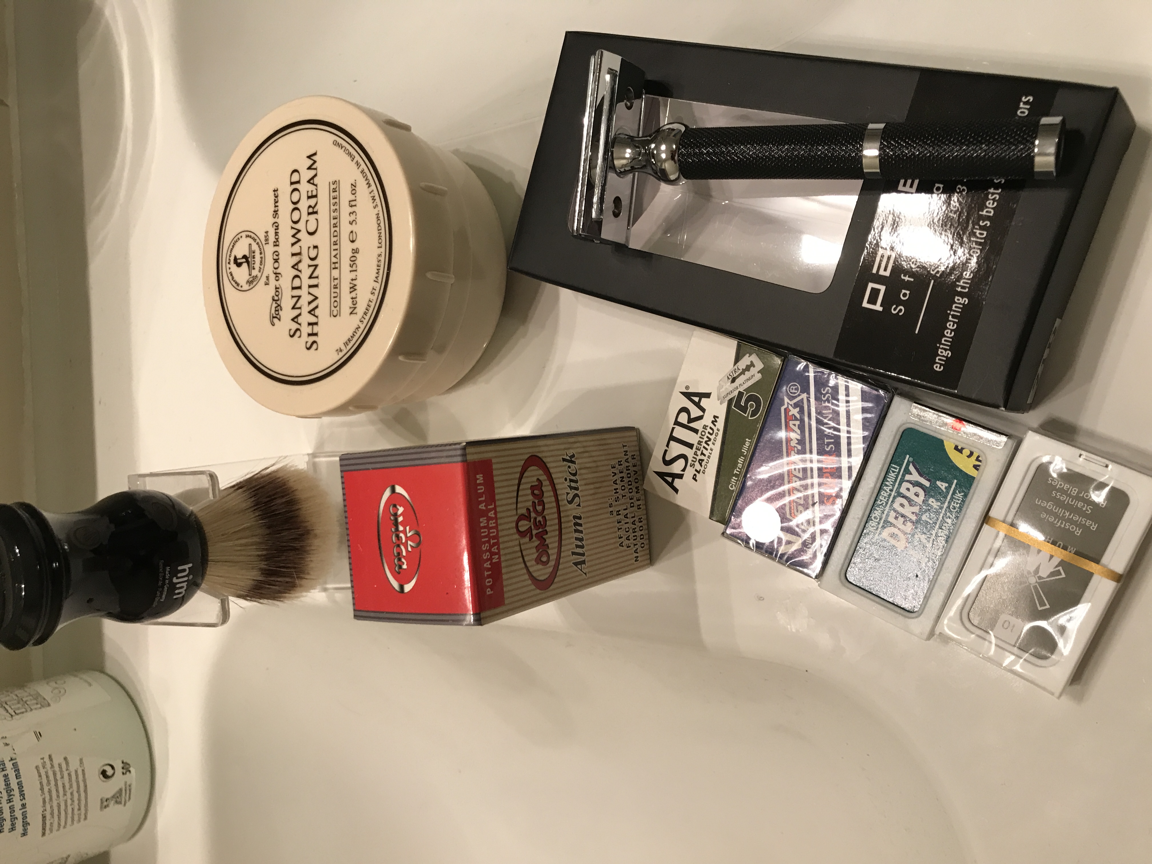 Vandaag mijn eerste schreden in de wereld van DE scheren gezet. Ik heb genoeg van de kosten van mijn Gilette Fusion en daar snijd ik mij ook nog regelmatig mee. Vandaag was ik in Almere. In het centrum zit een barbier die scheerspullen verkoop. Ik zie graag wat ik koop, zeker als het iets is waar ik nog weinig van weet. Het is het volgende geworden (zie de foto's):