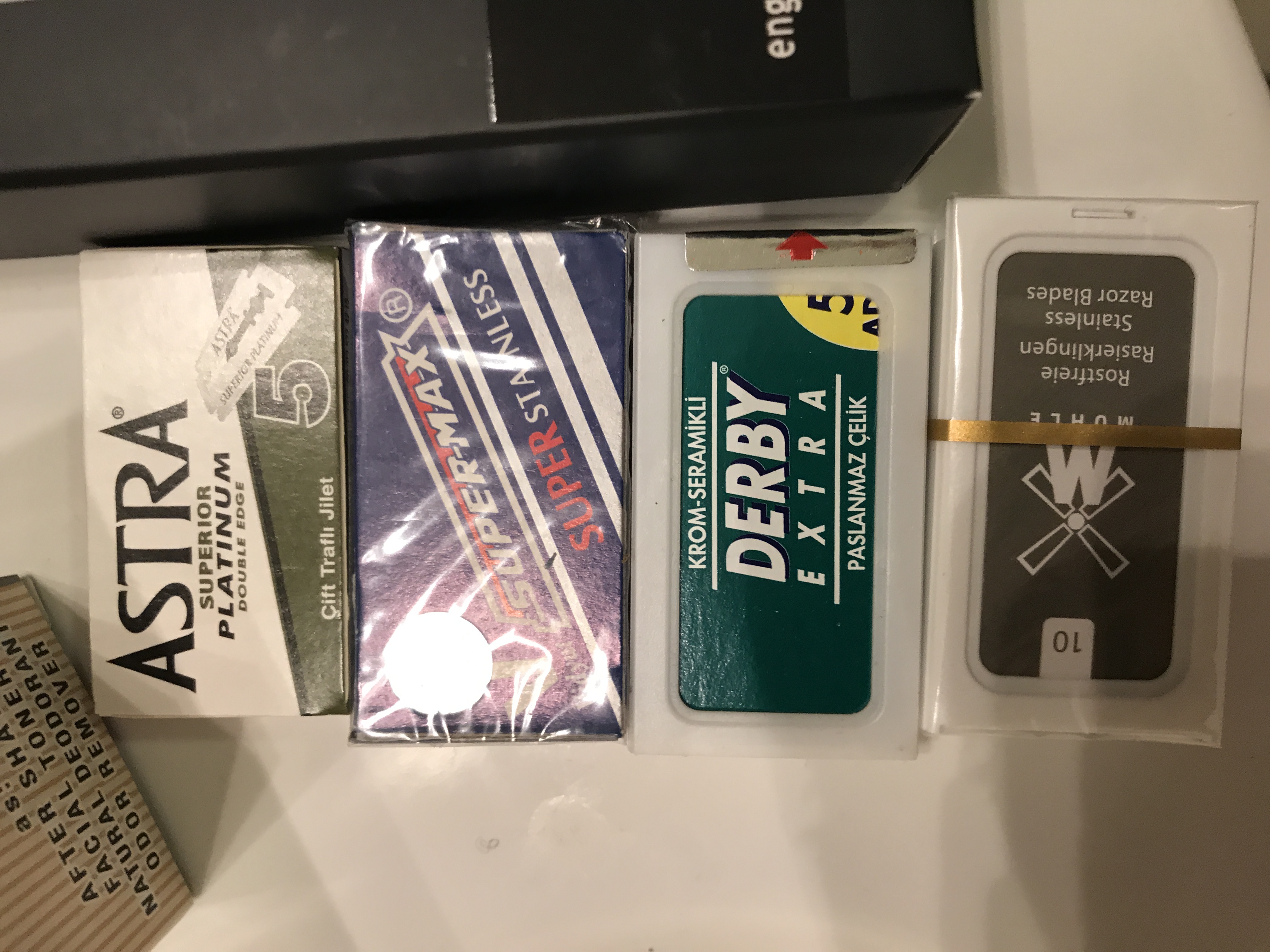 Ik scheer 11,5 maanden per jaar met een Edwin Jagger 89 en de overige dagen met een Muhle R41. Die laatste is me wat te agressief met zijn flinke blade exposure maar misschien kan de keuze van blade ook uitmaken. Astra bevalt beter dan feather in de R41. Welke blades zou ik nog meer kunnen proberen?