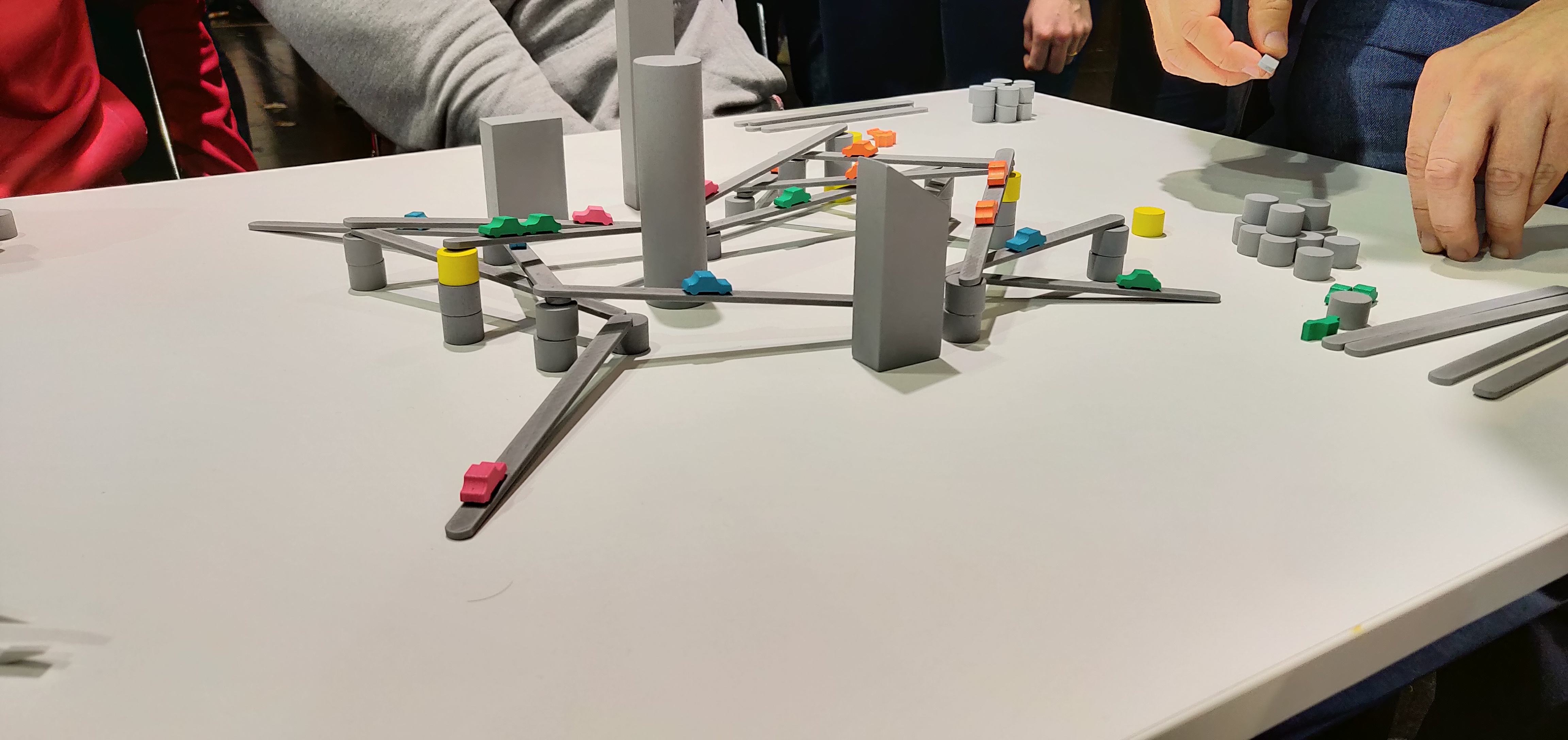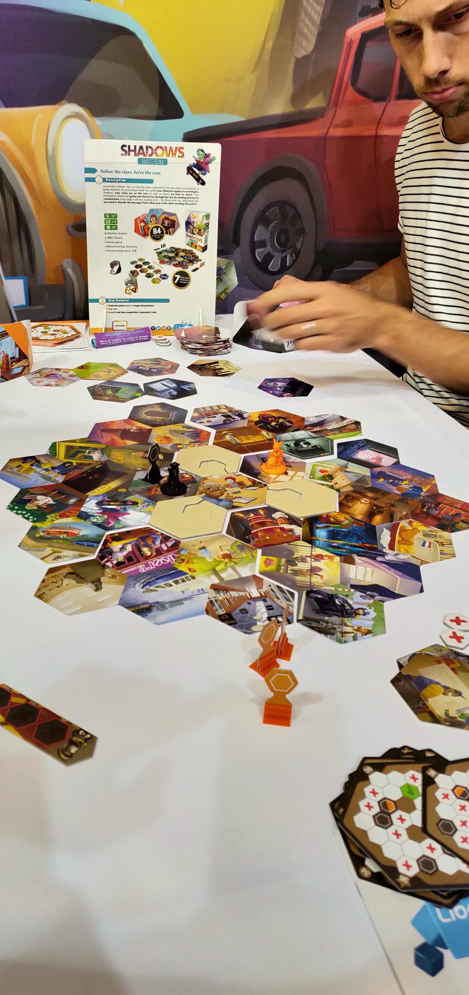 Hierna kwamen we toevallig Shadows: Amsterdam tegen en deze zag er interessant uit en dus direct maar geprobeerd. Het is een spel wat bestaat uit kaarten met mooi artwork a la Dixit. Je wordt opgedeeld in teams waarbij er in beide teams iemand is die aanwijzingen geeft en de rest van het team dan moet raden waar je naar toe moet gaan. Het doel is om drie plekken te vinden op de kaart en dan naar een vooraf gedefinieerd punt te gaan. Lukt dit dan win je de ronde. Best of 3 wint het spel. De teamcaptains kunnen kiezen uit 10 verschillende kaarten met artwork, hier kiezen ze 1 of 2 uit. Het team moet dan kiezen op basis van deze kaarten waar ze heen lopen met hun karakter. Als er 1 kaart wordt gegeven kun je 1 stap lopen, krijg je 2 kaarten moet je 2 stappen lopen.