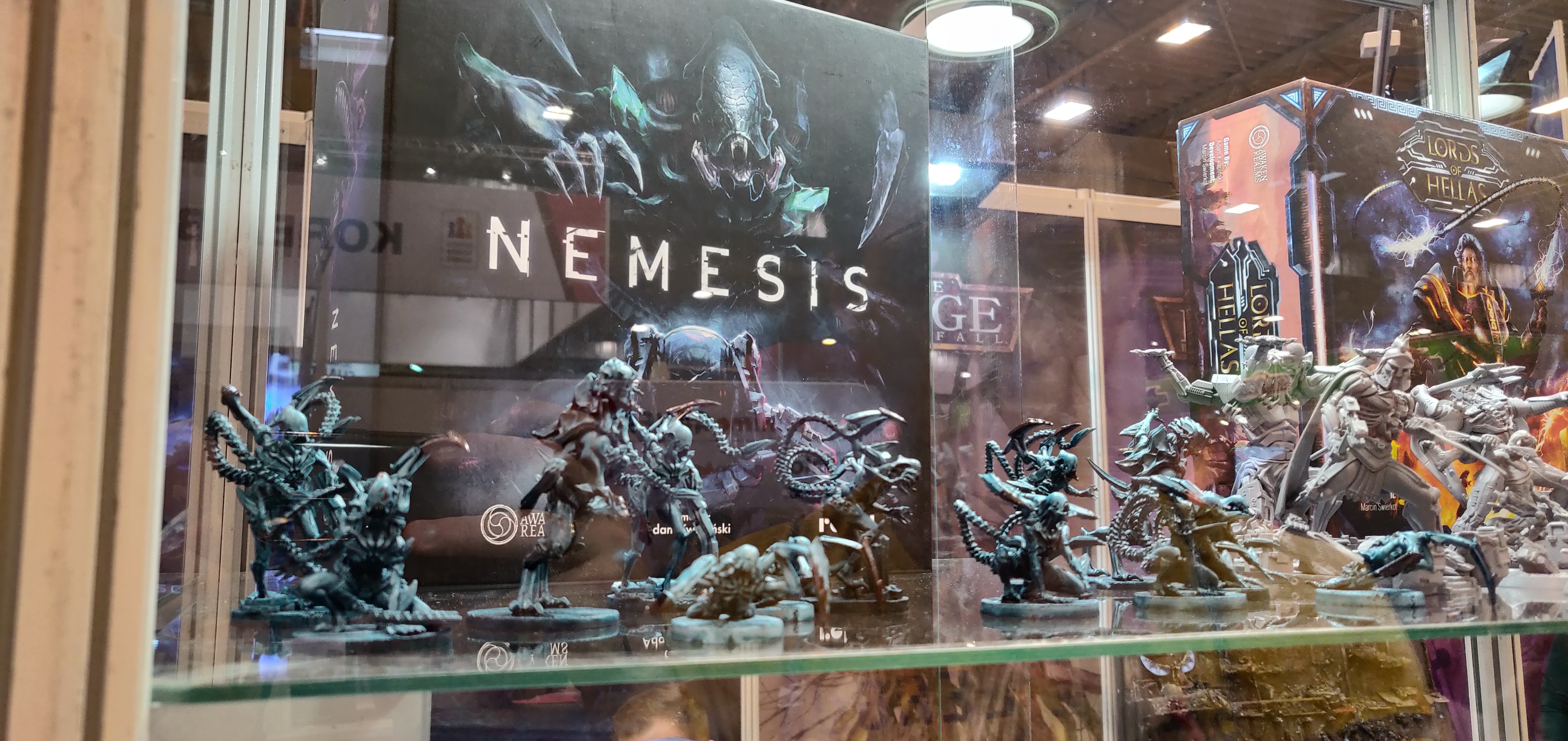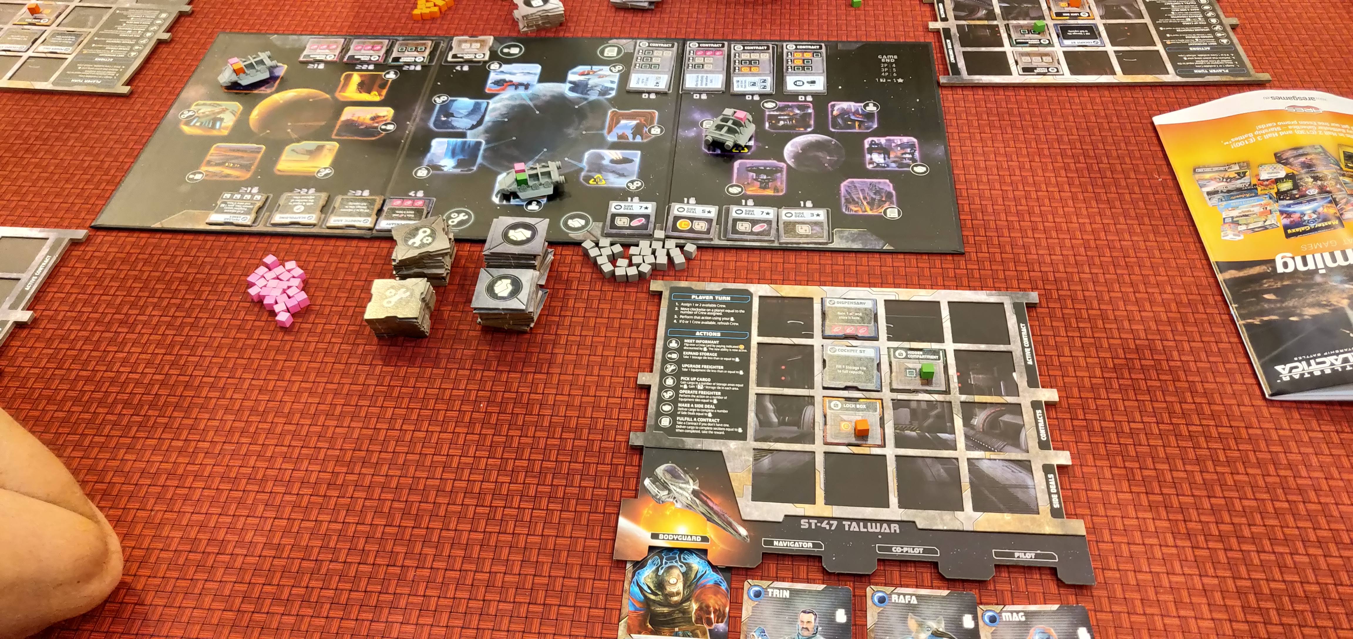 Hierna een plekje bemachtigd bij AEG om Scorpius Freighter te spelen. Dit leek een interessante euro waar je een smokkelaar in space speelt. Door middel van het verschuiven van 1 of 2 van de 4 karakter kaarten onder je spelersbord kun je 1 van de 3 schepen verplaatsen in het midden van het spelersbord. De plek waar je land bepaalt welke actie je dan kan kiezen. Het speelde opzich makkelijk weg, was niet al te complex, maar in de categorie, mwah, ik speel liever wat anders. Het zag er wel mooi uit en ook de components waren prima in orde.