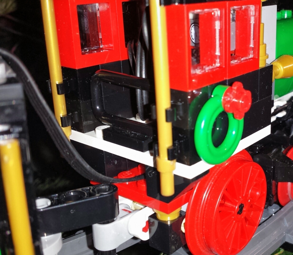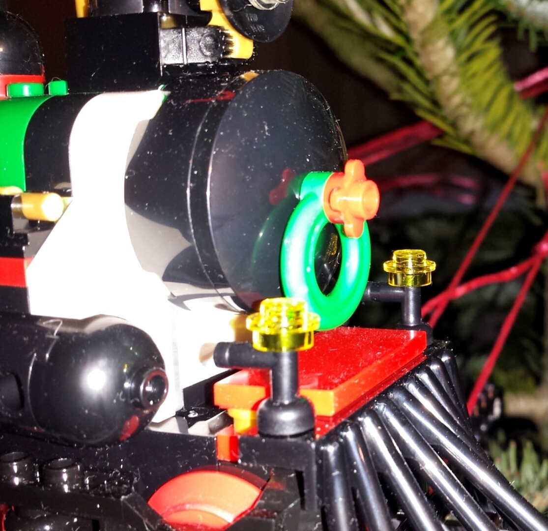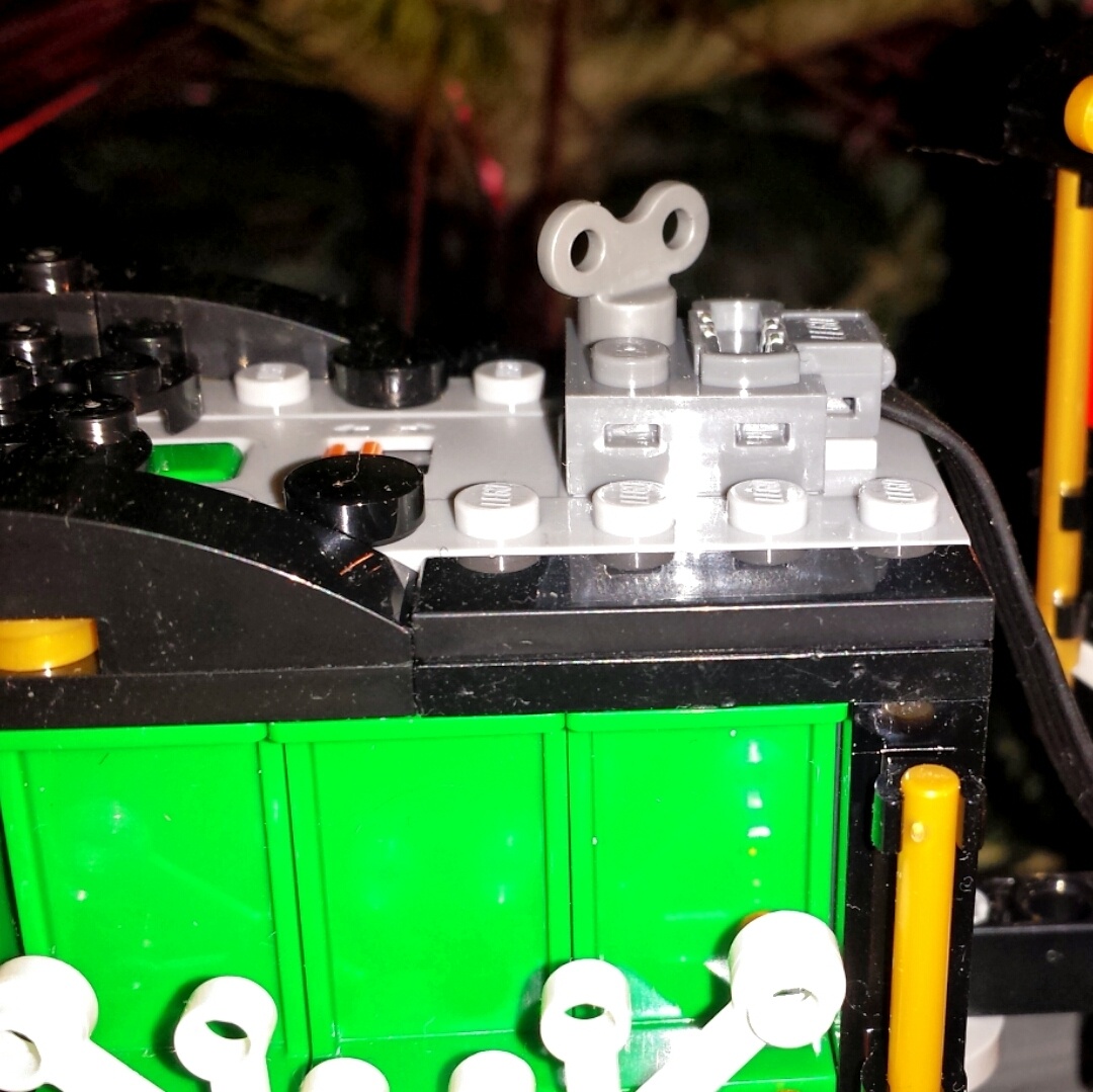 De zwarte zijkant met de raampjes heb ik ook aangepast zodat die ook nog steun heeft van de stud op de stekker, daarvoor moest de 4x1 zwarte brick sneuvelen en plaats maken voor een plates combi. De bovenkant van de ketel waar Lego wil dat de IR reciever komt, rust nu op 2x1 brick met daar boven 2x1 plate, die weer rust op een 8x1 plate die ik heb doorgetrokken tot over de IR reciever (zeg maar waar origineel de 8x2 technic plate zit) zodat het geheel weer structureel stevig is ipv dat het 50x uit elkaar dondert zoals bij het testen.