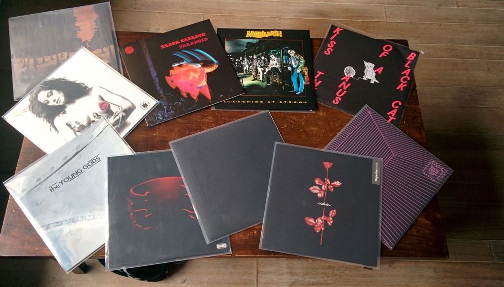 Mijn laatste aanwinsten. Ze blijven hier altijd eerst in 't 'vers binnen rekje' staan. Na een wasbeurt gaan ze in een klassieke stugge PVC hoes en dan pas de kast in. Ben helaas door m'n PVC hoezen heen, dus staan ze nog te wachten. Heb 't liefste tweedehands hoezen, die zijn extra stug en perfect voor oude elpees
