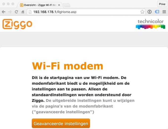 Omdat ik dat vreemd vond wou ik onderzoeken waar dit vandaan kwam. Inloggen op mijn router was niet mogelijk, de login pagina wou niet laden. Vervolgens ben ging ik inloggen op mijn Ziggo modem (via 192.168.178.1) en op de login pagina viel mij gelijk het logo van Technicolor op. (terwijl ik een Cisco modem heb).