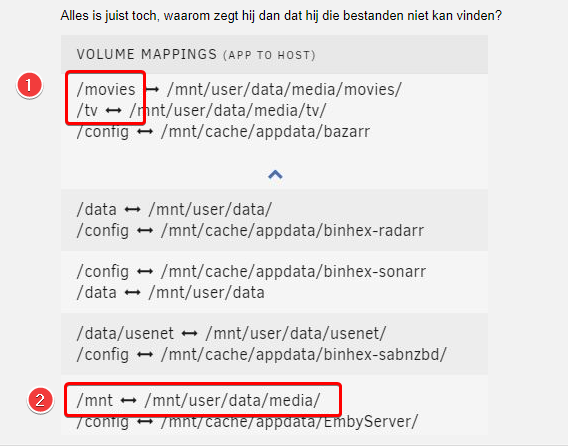 Ik gebruik geen Unraid, dus daar kan ik niet op commenten. Maar je foutmelding ziet eruit alsof je het verkeerd om hebt gezet. Links is container, rechts is host. Daarnaast zou ik je ten zeerste aanraden om media details zoals hierboven uit te commenten aangezien het onder piracy valt (ook in je vorige posts).
