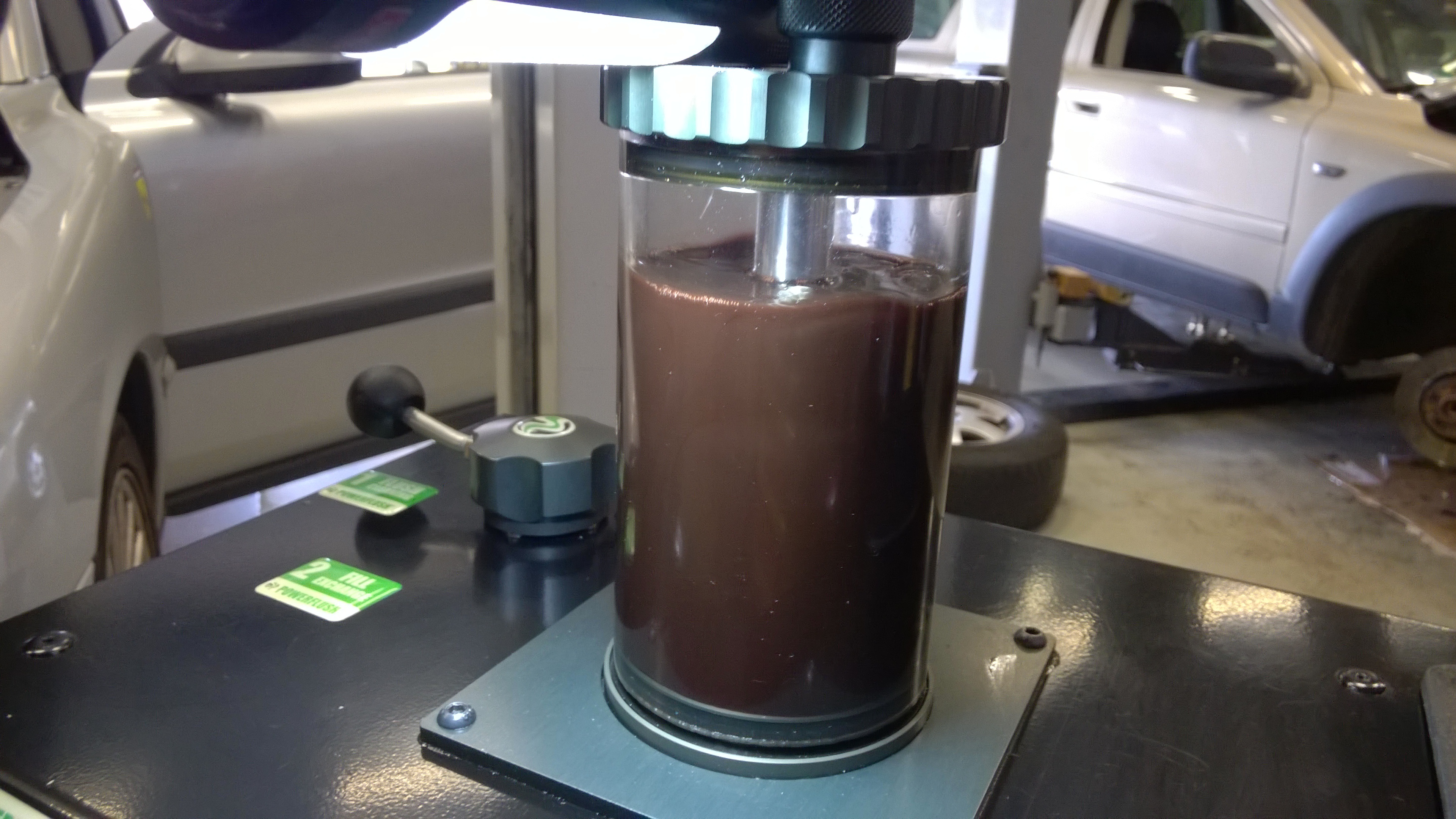 Vandaag heeft de 2001 S60 een powerflush gehad met 326.000 km. De olie rook verbrand en zag er zo uit: