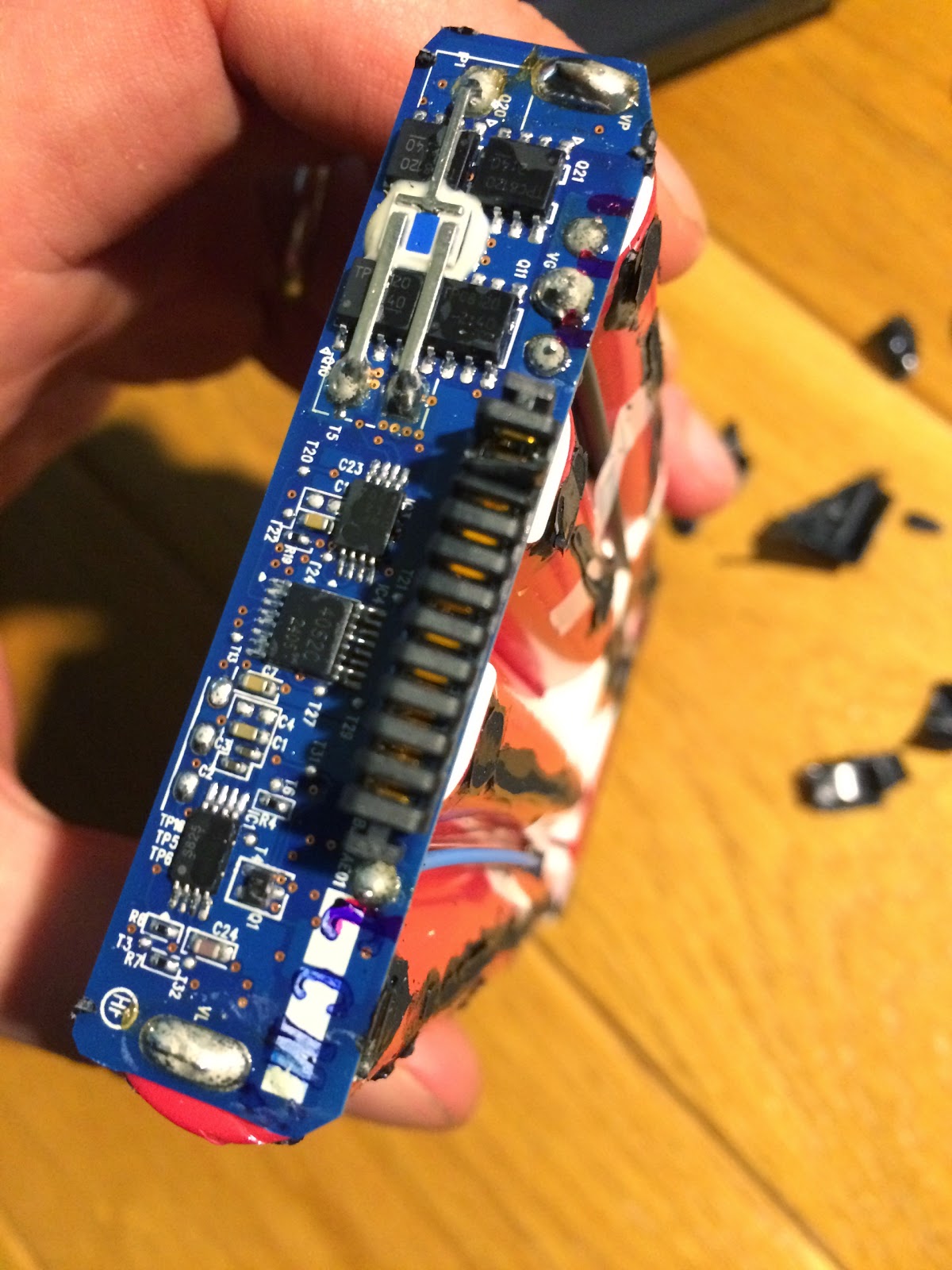 Hier zit nog wat meer elektronica op. Dat printje bevat een vorm van batterij management, het enige wat die kan doen om de accu uit te schakelen is tegen de lader zeggen dat hij nooit meer opgeladen mag worden. Die heeft een mooi lampje die aangeeft: "Accu is dooood!".