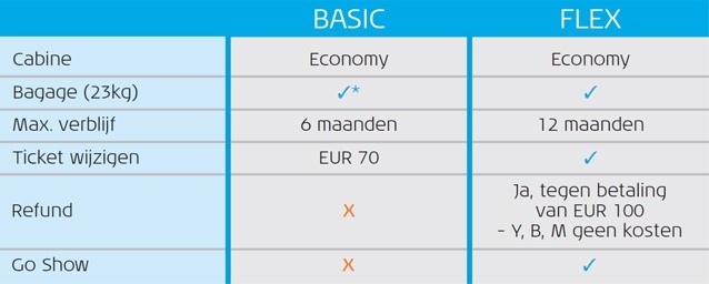 FLEX staat voor 23 kg bagagevrijdom, kosteloos wijzigen van datum én de mogelijkheid om het ticket ter restitutie aan te bieden. Hiervoor wordt €100 in rekening gebracht (geen kosten voor de hoogste boekingsklassen in economy; Y, B en M). Het tarief voor FLEX is BASIC + €99 (op retourbasis).