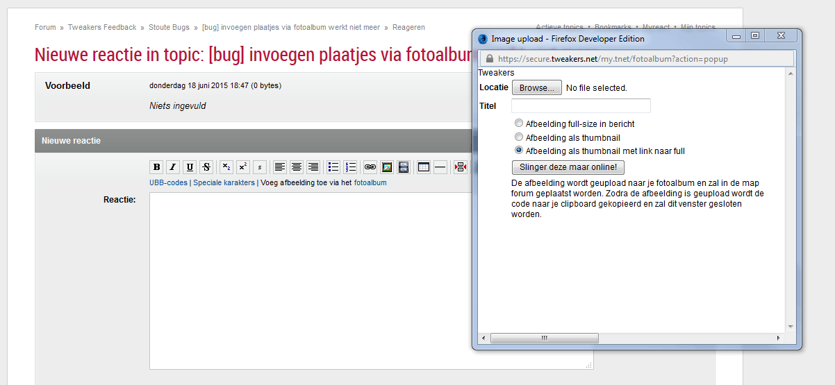 Het enige dat ik nog kan bedenken, is dat er iets in Firefox popups blank maakt. Maar het is geen adblocker o.i.d. want *tweakers* is whitelisted in al m'n anoniem-dingesen en adblockers.