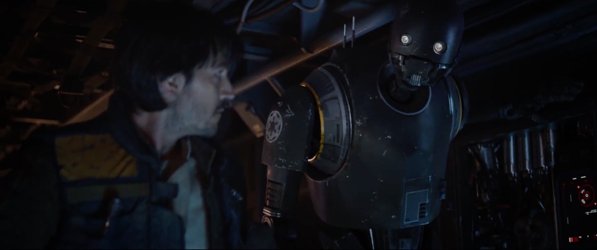 in het volgende shot zien we Jyn, Cassian en K-2 een Imperial basis infiltreren. K-2 en Jyn komen aardig overtuigend over. Cassian had zich eerst even mogen scheren, bij hem is het natuurlijk in no time duidelijk dat hij hier niet thuis hoort.