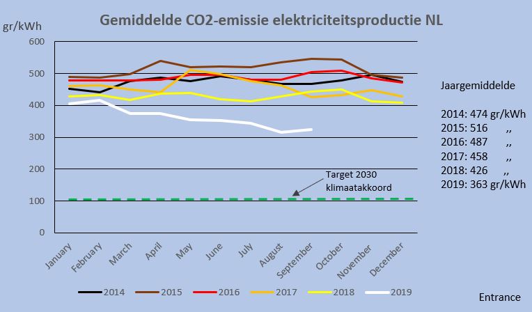 Dat Nederland grotendeels op kolenstroom loopt is inmiddels al sterk achterhaald. De CO2 uitstoot per kWh daalt gestaag. Vooral door het vervangen van kolen door gas, maar ook door zon PV en biomassa. Het bijbouwen van windmolens gaat de laatste jaren niet echt snel, maar daar komt de komende jaren wel verandering in.