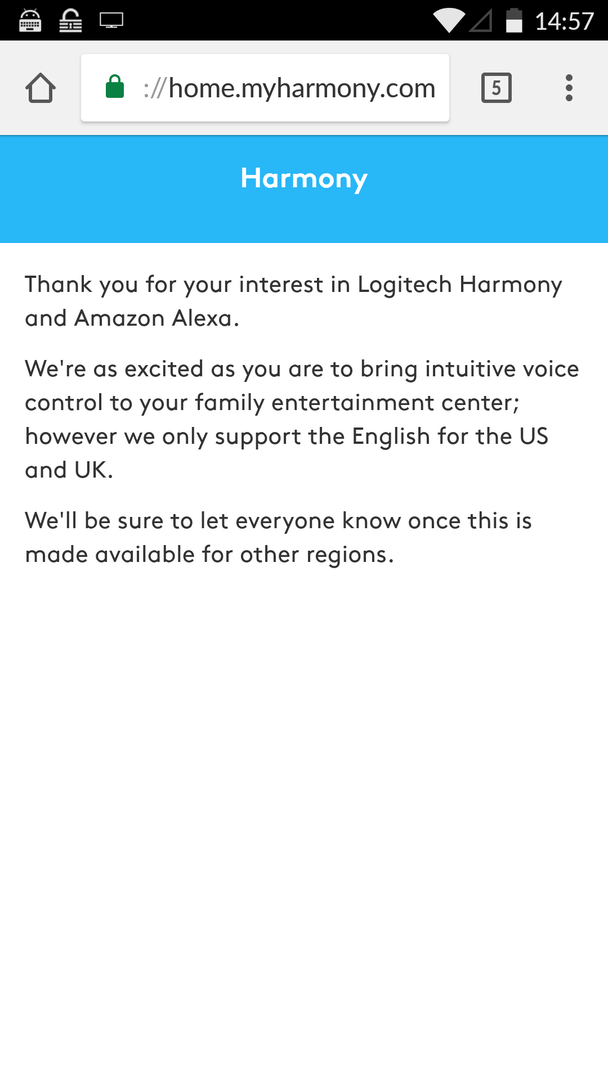 Hierna lukte het om de Harmony skill te downloaden. Je moet bij het aanmaken van een nieuwe Logitech account e-mail als optie gebruiken en niet Google of Facebook. Ik kon ook met geen mogelijkheid op de US site van Logitech komen om een account aan te maken, vandaar de rare url met de toevoeging MartiniWeb.