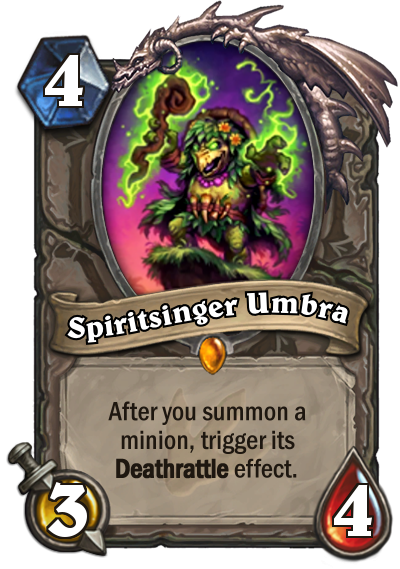 Ten tweede zijn dubbele battlecry's meer waard dan dubbele deathrattles. Een battlecry is al meer waard dan een deathrattle: een battle cry geeft je onmiddellijke value, een deathrattle geeft je uitgestelde value. Brann geeft je dus onmiddellijke dubbele value, terwijl Spiritsinger Umbra onmiddellijke value is met eventueel nog later je eigen deathrattle. Niet te vergeet deathrattles kunnen op het bord gesilenced worden.
