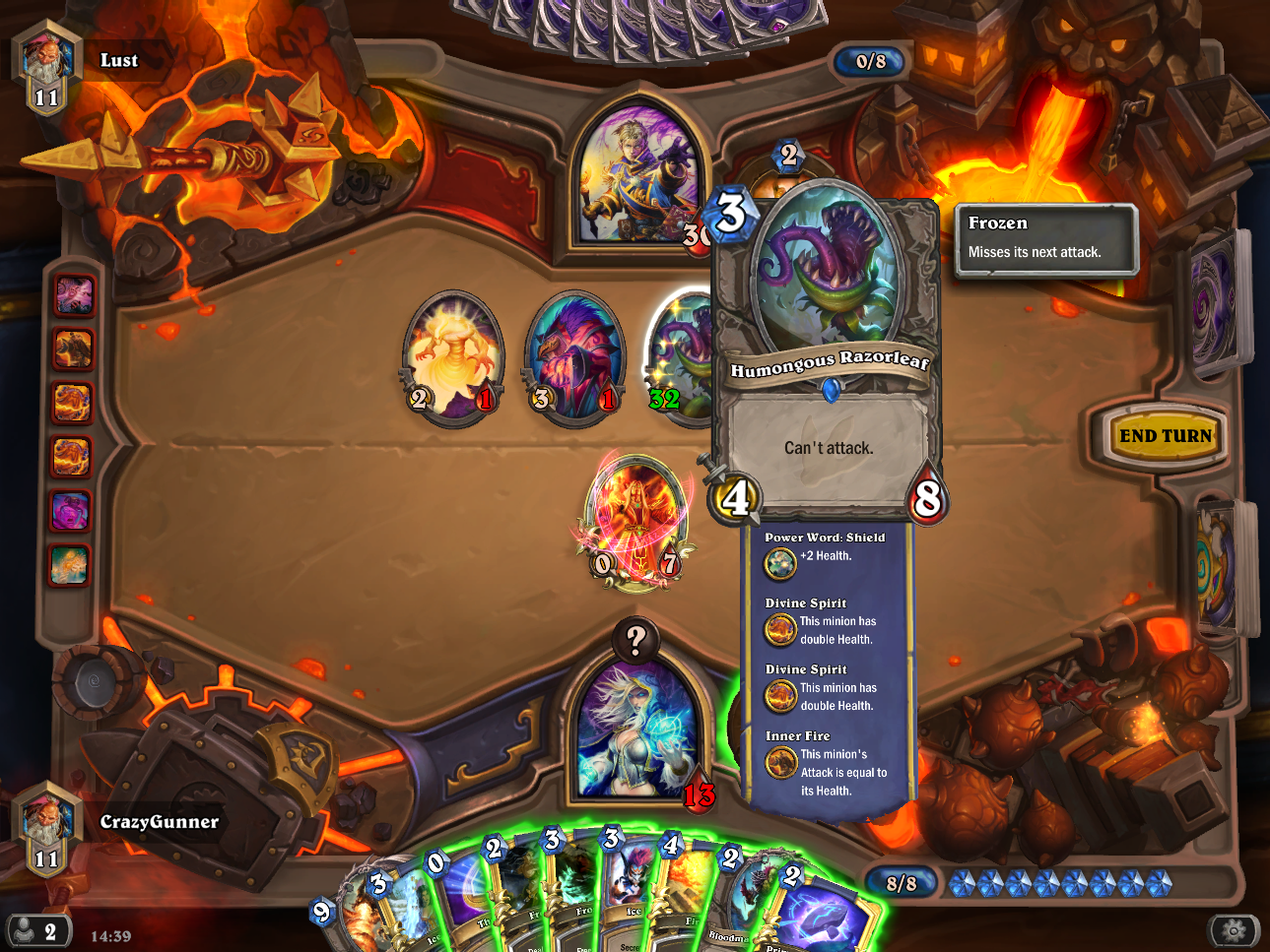 EDIT: Net dikke fout tegen Druid gemaakt, had super veel armor/hp, stond uiteindelijk op 22 hp, speelde Ice Block, Frost Bolt en Fireball, dus 13 hp over, prima dacht ik, ik had volgende beurt 15 damage. Maar toen realiseerde ik me dat ik Medivh's Valet had gerekend voor 3 damage, had die beurt natuurlijk wel gewerkt, maar volgende beurt niet maar.