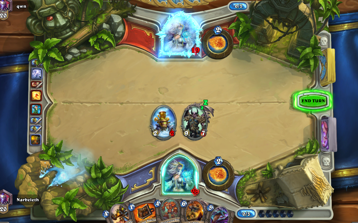 Natuurlijk had ik ook eerder mijn play moeten doen, maar als je met 2 health zit, geen Ice Block/Barrier in hand, een veld tegen je hebt terwijl hij op 24 mana staat met Coghammer, dan is het lastig navigeren.