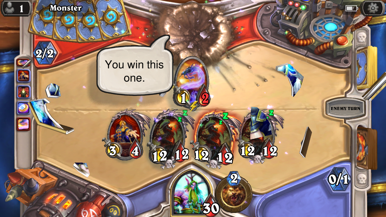 Dat is ook waarom Face Hunter zo werd gehaat, Secret Paladin, Patron Warrior en gedeeltelijk ook OTK decks in het algemeen. Sommige potjes zijn moeilijker dan andere, maar vaak heb je toch wel het gevoel dat je misschien beter had kunnen spelen, of dat de ander gewoon heel goed speelde of ook maar iets wat 'eerlijk' aanvoelt. Face Hunter is retarded en de tegenstander speelt alleen (wat jij doet heeft vrijwel geen effect op zijn speelstijl), Secret Paladin voelde in een gedeelte van de potjes enorm sterk omdat turn 6 (en 7&8) heel sterk was, Patron omdat je 3 taunts kon neerzetten en hij walste nog steeds over je heen, en natuurlijk in sommige gevallen ook OTK decks in het algemeen, al hebben de meeste OTK decks wel harde counters, en is het toch echt skill van beide die bepaalt wie wint.