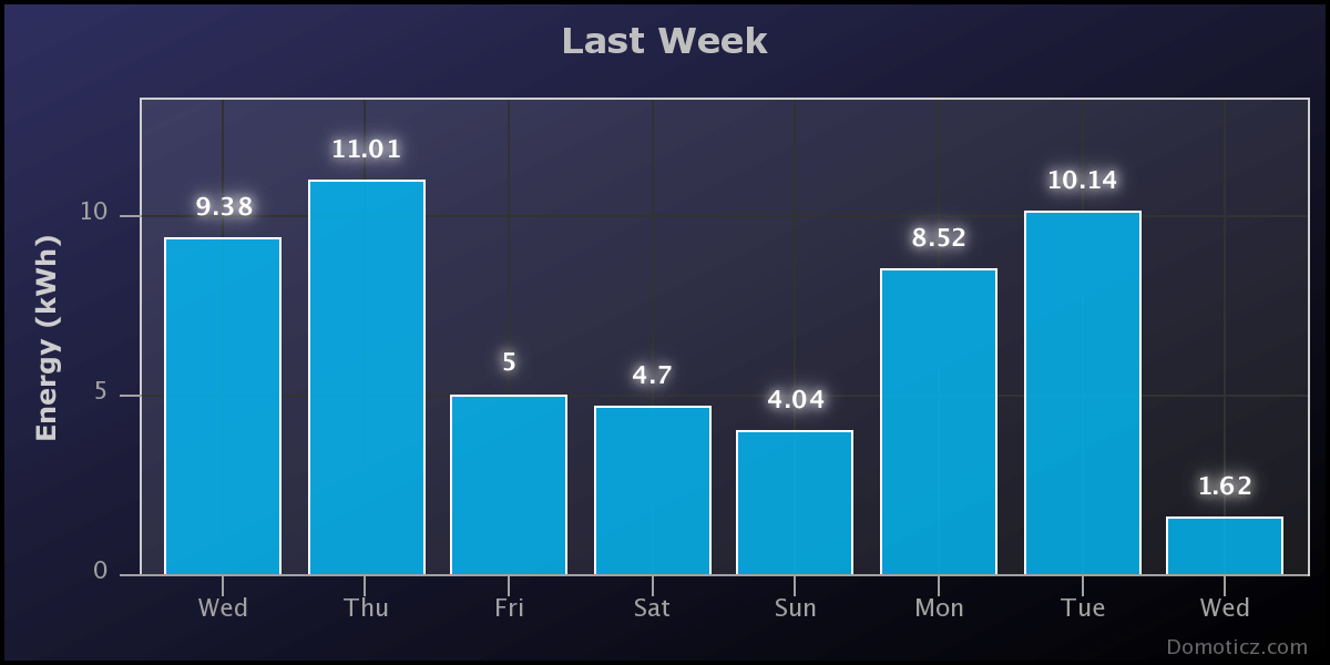 Zie hierbij mijn daggrafiek van gebruikte energie (ik log mijn WP niet apart). Patroon van + 1700 W is de WP.