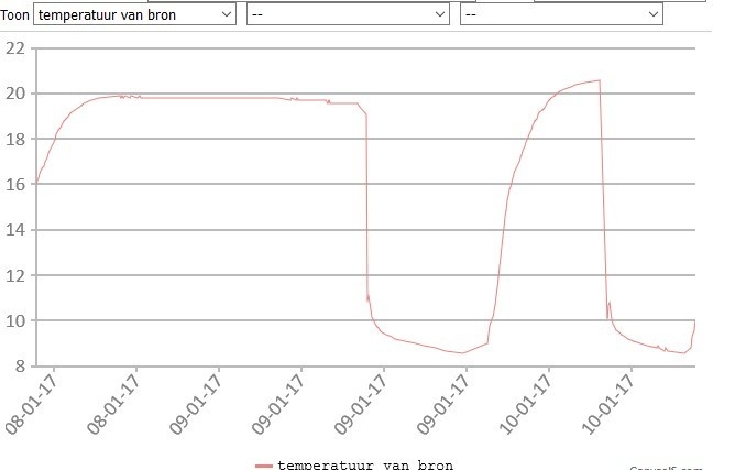 In het plaatje van de bron zie je meest links op 8 januari dat de bron temp oploopt, wp ging uit, de 9de en de 10de draait hij gewoon in het plaatje. Het is een beetje vreemde schaal, het zijn 3 dagen in totaal, komt rechtstreeks uit de nrgteq webpagina. Ik zie wel eens wat overlap/verschuiving doordat domoticz van 00.00 - 23.59 rekent, maar hier klopt het gewoon. Elektrisch element zit in de boiler, maar niet op 230 volt aangesloten, gaat ie ook niet onnodig lopen.