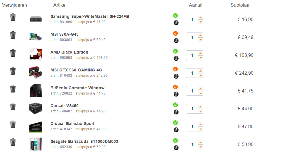 Hij kwam zelf met bovenstaande onderdelen. Ipv de scythe mugen 4 had hij akasa venom nano ak-cc4005sp01 opgeschreven maar die kon ik niet in de pricewatch vinden dus heb ik deze vervangen.