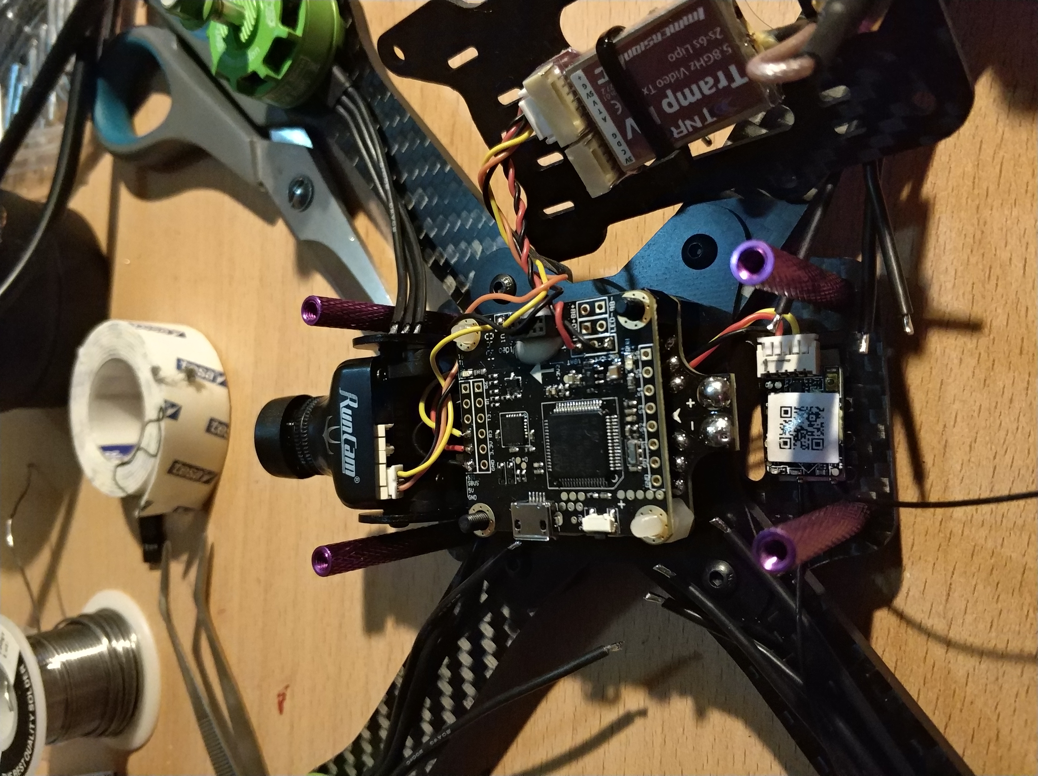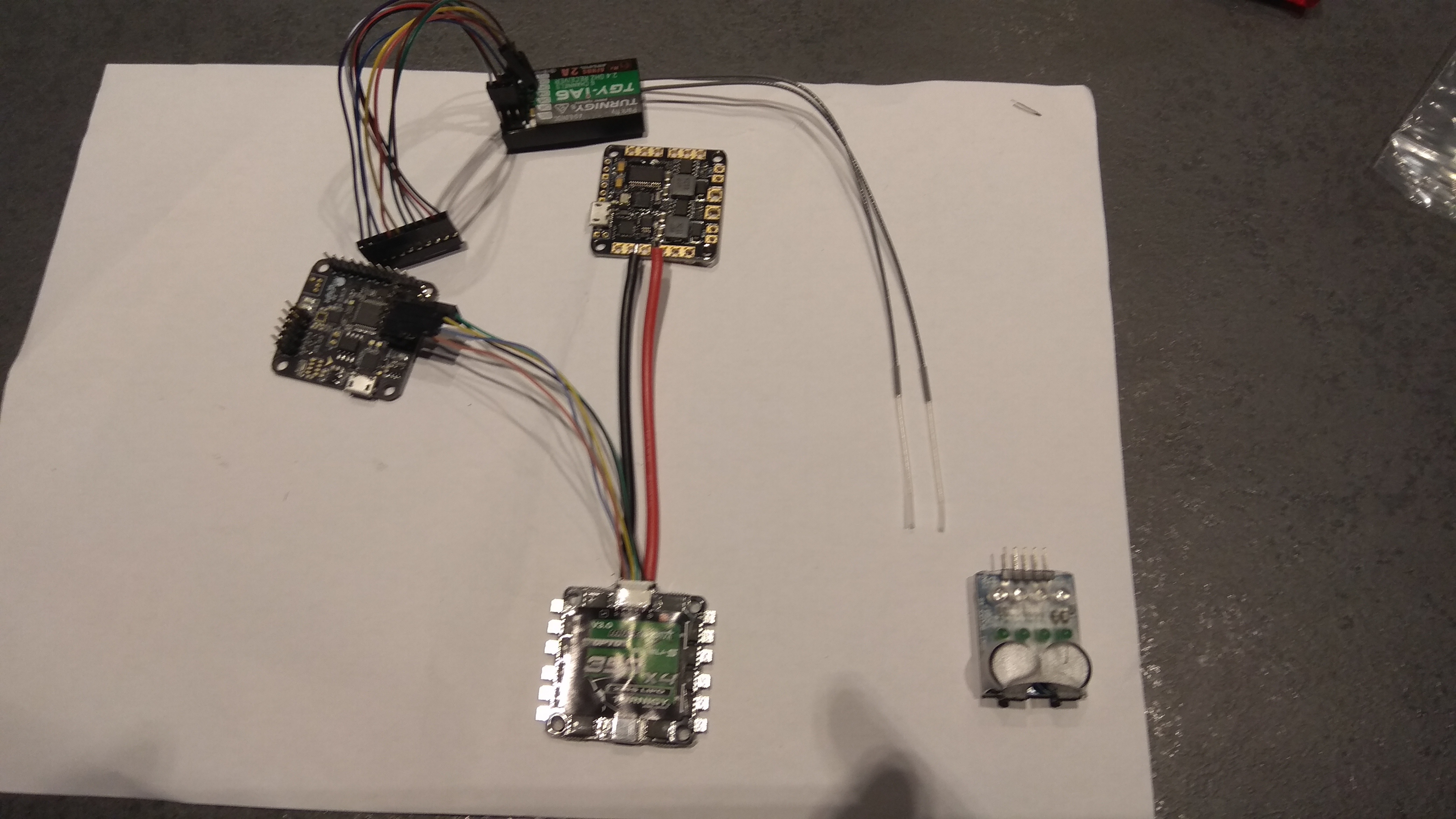 En ook de SPF3 laat je zelden in de steek...je hebt dan niet alle hedendaagse features maar het vliegt wel. Ook de Matek HubOSD doet z'n werk nog steeds prima, heeft een degelijke OSD en met een 1k uf 35v cap op de batterij draden is de FPV feed prima te doen.