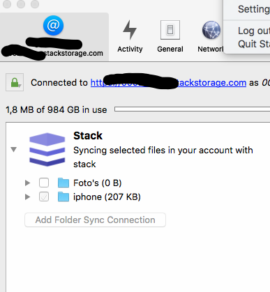 In de Stack-software de meest linkse tab aanklikken (met je gebruikersnaam). Op de knop met de puntjes rechts naast de map klikken en vervolgens "verwijderen sync" aanklikken.