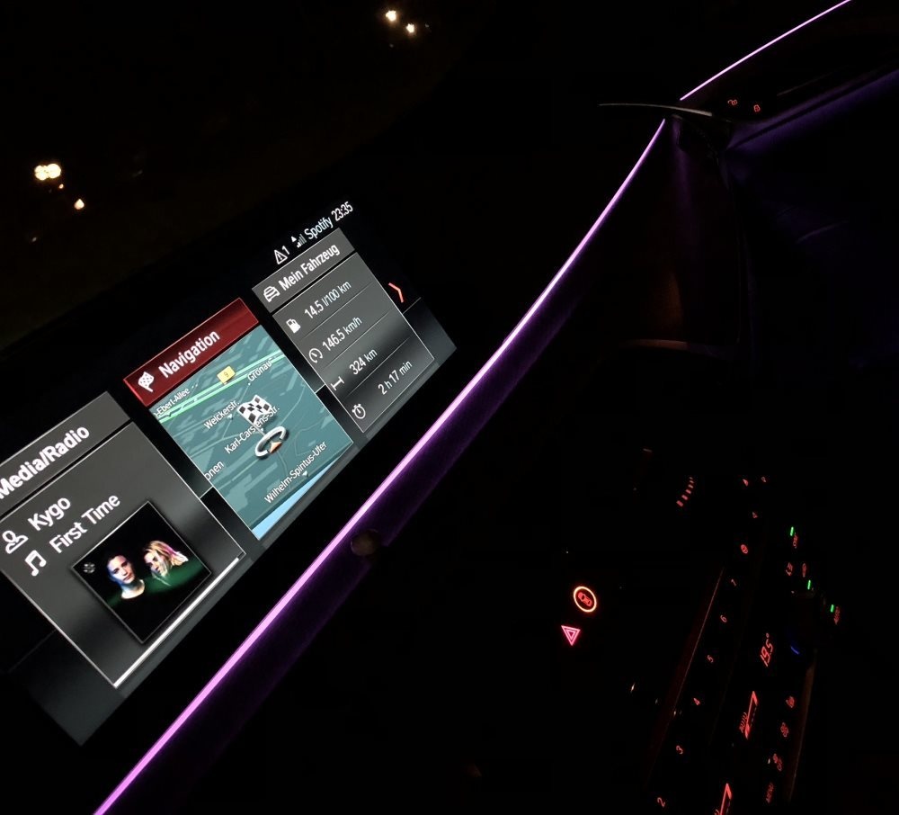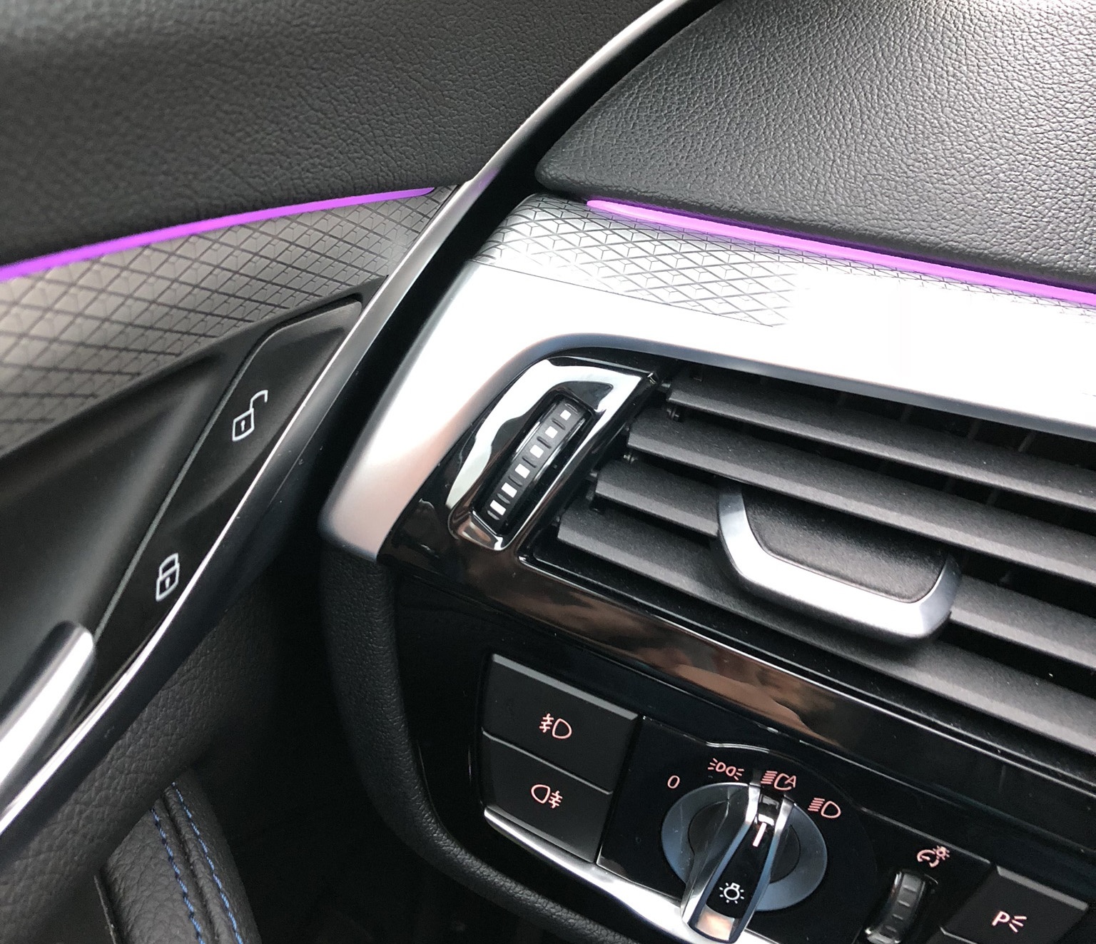 In een BMW wil je echter maar één kleur: oranje, zodat deze 's nachts naadloos in het interieur past. Ze moeten achterin komen (2x), en ik heb 4-zone airco welke ook als basiskleur oranje heeft. Een beetje eenheid is wel fraai dan.